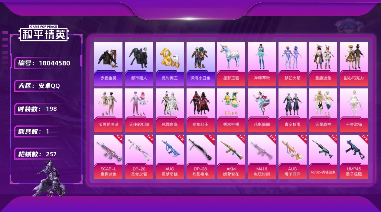 [18044580]安卓 手Q-无敌战神框-14粉装-11特效枪-1载具-5粉色飞行器-89881热力值-16王牌印记-198套装-257枪皮 【热门品类】:粉装-梦幻火箭,粉装-童趣迷兔,套装-浪漫天命,套装-赤蝎幽灵,套装-都市猎人,套装-派对舞王,套装-深海小丑鱼,套装-龟仙人,套装-潮萌小黄鸭,套装-暗影哥特,套装-粉红小猪,角色-8号机,角色-Mark.06 【粉色套装】:粉装-甜心巧克力,粉装-宝贝奶油派,粉装-天使彩虹糖,粉装-梦幻火箭,粉装-冰霜白皇,粉装-童趣迷兔,粉装-炙焰红王,粉装-香水柠檬,粉装-花影阑珊,粉装-青空秋雨,粉装-碧蓝澄空,粉装-天星战神,角色-千金淑猫,角色-异瞳寒姬 【粉色枪皮等级】:AKM-绿萝繁花(五级),SCAR-L-童趣迷兔(七级),M416-电玩时刻(五级),AUG-星梦奇缘(六级),AUG-暖羊咩咩(五级),M762-青锋波束(五级),UMP45-量子极限(五级),Kar98K-巳巳如意(五级),Mk14-福马献瑞(一级),DP-28-圣堂之誓(七级),DP-28-豹影疾电(五级) 【粉色载具】:星梦玉骢 【粉色枪皮】:AKM-绿萝繁花,SCAR-L-童趣迷兔,M416-电玩时刻,AUG-星梦奇缘,AUG-暖羊咩咩,M762-青锋波束,UMP45-量子极限,Kar98K-巳巳如意,Mk14-福马献瑞,DP-28-圣堂之誓,DP-28-豹影疾电 【粉色飞行器】:炫彩糖果飞行器,梦幻火箭飞行器,曦光华影飞行器,幻星舰长飞行器 【粉色降落伞】:幻影战神降落伞,甜心宝贝降落伞,梦幻火箭降落伞,神秘黑猫降落伞,童趣迷兔降落伞,香水柠檬降落伞,洛神天依降落伞,青空秋雨降落伞,暗夜鎏金降落伞,音爆索尼克降落伞,第五大道降落伞,天星战神降落伞,未来歌姬降落伞,炫光之旅降落伞,星梦奇缘降落伞,宇宙意志降落伞,BEARBRICK降落伞,千金淑猫降落伞,幻彩电音降落伞,时光之吻降落伞,炫彩糖果降落伞 【稀有套装】:套装-龟仙人,套装-巳巳如意,套装-雪国风尚,套装-炫彩糖果,套装-马上有钱,套装-雏菊兔兔,套装-萝兰蝴蝶,套装-小熊娃娃,套装-糖糖葫芦,套装-青团波波,套装-棉花软糖,角色-都市丽猫,角色-摩登魅猫,套装-燕燕于飞,套装-鱼渊荷华,套装-极速光影,套装-云朵鹅,套装-雪绒豹,套装-朱霞炽焰,套装-凌霄紫焰,套装-擎苍青焰,角色-紫俏灵猫