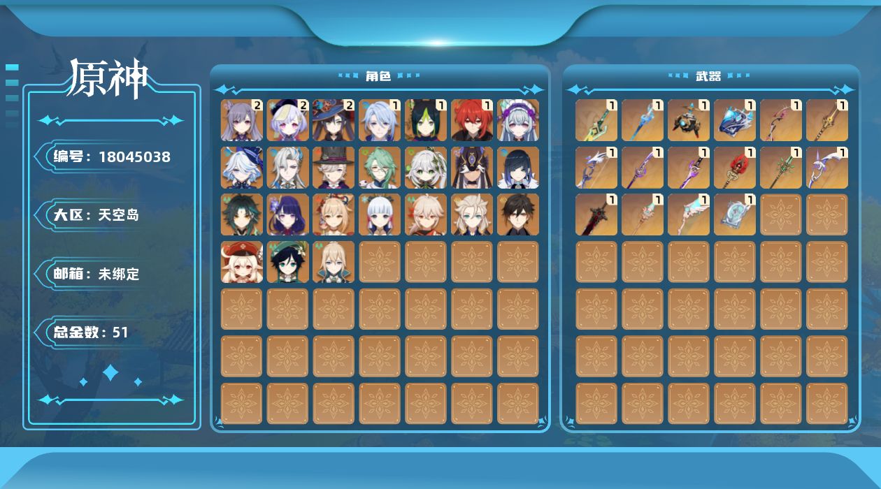 0命芙宁娜,0命那维莱特,0命林尼,0命白术,0命纳西妲,0命赛诺,1命提纳里,0命夜兰,1命神里绫人,0命雷电将军,0命枫原万叶,0命神里绫华,0命钟离,0命魈,0命宵宫,0命温迪,0命可莉,0命阿贝多,2命刻晴,2命七七,0命琴,2命莫娜,1命迪卢克,0命梦见月瑞希,精1静水流涌之辉,精1金流监督,精1万世流涌大典,精1最初的大魔术,精1赤沙之杖,精1若水,精1薙草之稻光,精1雾切之回光,精1护摩之杖,精1四风原典,精1和璞鸢,精1天空之脊,精1天空之翼,精1阿莫斯之弓,精1狼的末路,精1山王长牙