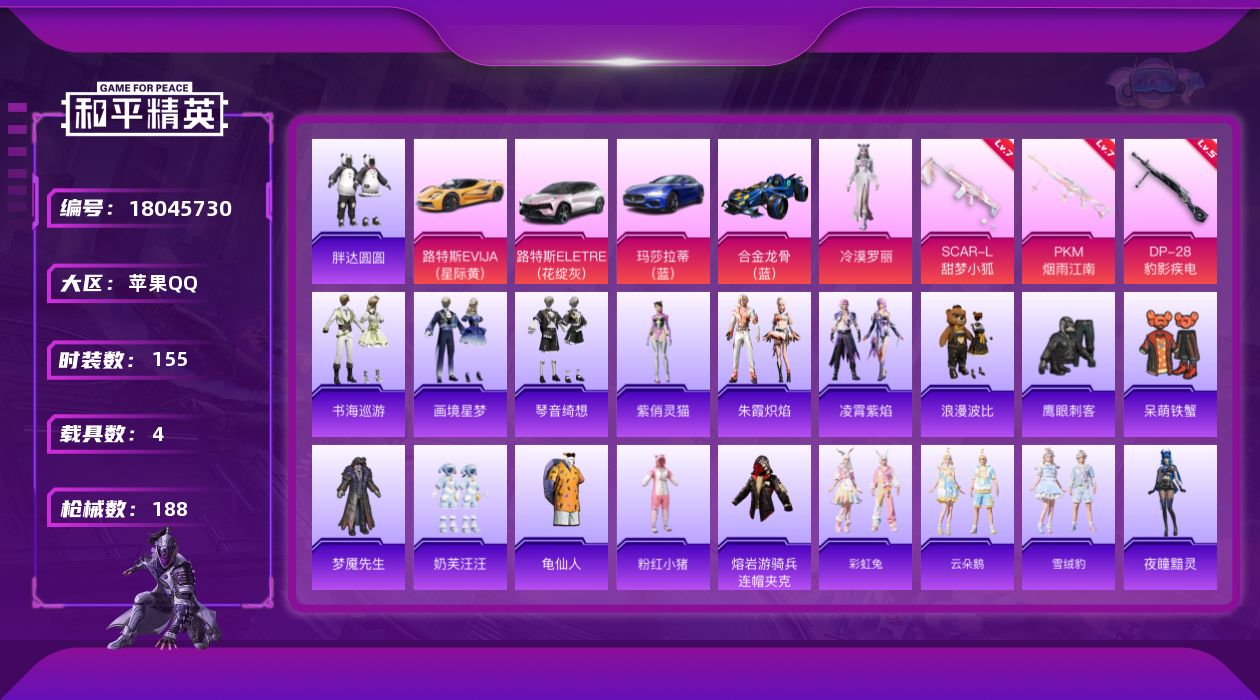 [18045730]苹果 手Q-1粉装-6特效枪-4载具-1粉色飞行器-60096热力值-13王牌印记-155套装-188枪皮 【热门品类】:套装-胖达圆圆,套装-龟仙人,套装-浪漫波比,套装-粉红小猪,熔岩游骑兵连帽夹克 【粉色套装】:角色-冷漠罗丽 【粉色枪皮等级】:SCAR-L-甜梦小狐(七级),UMP45-萌骑冒险(五级),AKS-74U-森灵之息(五级),Mk14-福马献瑞(三级),DP-28-豹影疾电(五级),PKM-江南烟雨(七级) 【粉色载具】:路特斯EVIJA(星际黄),路特斯ELETRE(花绽灰),玛莎拉蒂Ghibli(蓝),合金龙骨(蓝) 【粉色枪皮】:SCAR-L-甜梦小狐,UMP45-萌骑冒险,AKS-74U-森灵之息,Mk14-福马献瑞,DP-28-豹影疾电,PKM-江南烟雨 【粉色飞行器】:炫彩糖果飞行器 【粉色降落伞】:王牌四分卫降落伞,青春物语降落伞,恐龙拽拽降落伞,甜梦小狐降落伞,彩虹甜喵降落伞,炫光之旅降落伞,极意拳锋降落伞,炫彩糖果降落伞 【稀有套装】:套装-龟仙人,套装-雪国风尚,套装-炫彩糖果,套装-马上有钱,套装-迅捷龙虾,套装-彩虹兔,套装-云朵鹅,套装-雪绒豹,角色-夜瞳黯灵,套装-朱霞炽焰,套装-凌霄紫焰,角色-紫俏灵猫,套装-书海巡游,套装-画境星梦,套装-琴音绮想,套装-雨过天青,套装-红釉青花 【稀有枪皮】:AUG-冰晶雪宝,AKM-影袭,AKM-破晓战魂,AKM-缤纷海域,AKM-萌趣颜团子,AKM-霓虹街区,AKM-龙的传人,M16A4-幻世战舞者,M16A4-甜心亚梦,M16A4-红色方程式,M16A4-蓝色火焰,SCAR-L-炫彩节奏,SCAR-L-玉兔迎春,M416-糯团青竹,M416-蓝色火焰,GROZA-影袭,GROZA-治愈之星,GROZA-田园牧歌,GROZA-青春物语,AUG-天降萌叽,AUG-甜蜜菠萝,AUG-青春冒险家,QBZ-原初圣火,QBZ-彩虹符号,QBZ-诡娃娃,QBZ-飞驰魅影,M762-天降萌叽,M762-彩虹符号,M762-拳皇97,M762-牛气冲天,M762-诡娃娃,M762-云朵鹅,Mk47-妙红点点,AC-VAL-天降萌叽,AC-VAL-甜心亚梦,蜜獾-娇憨猪猪,ACE32-画境星梦,ARX-凌霄紫焰,UZI-啾咪啾咪,UZI-娇憨猪猪,UZI-影袭,UZI-炫彩节奏,UMP45-