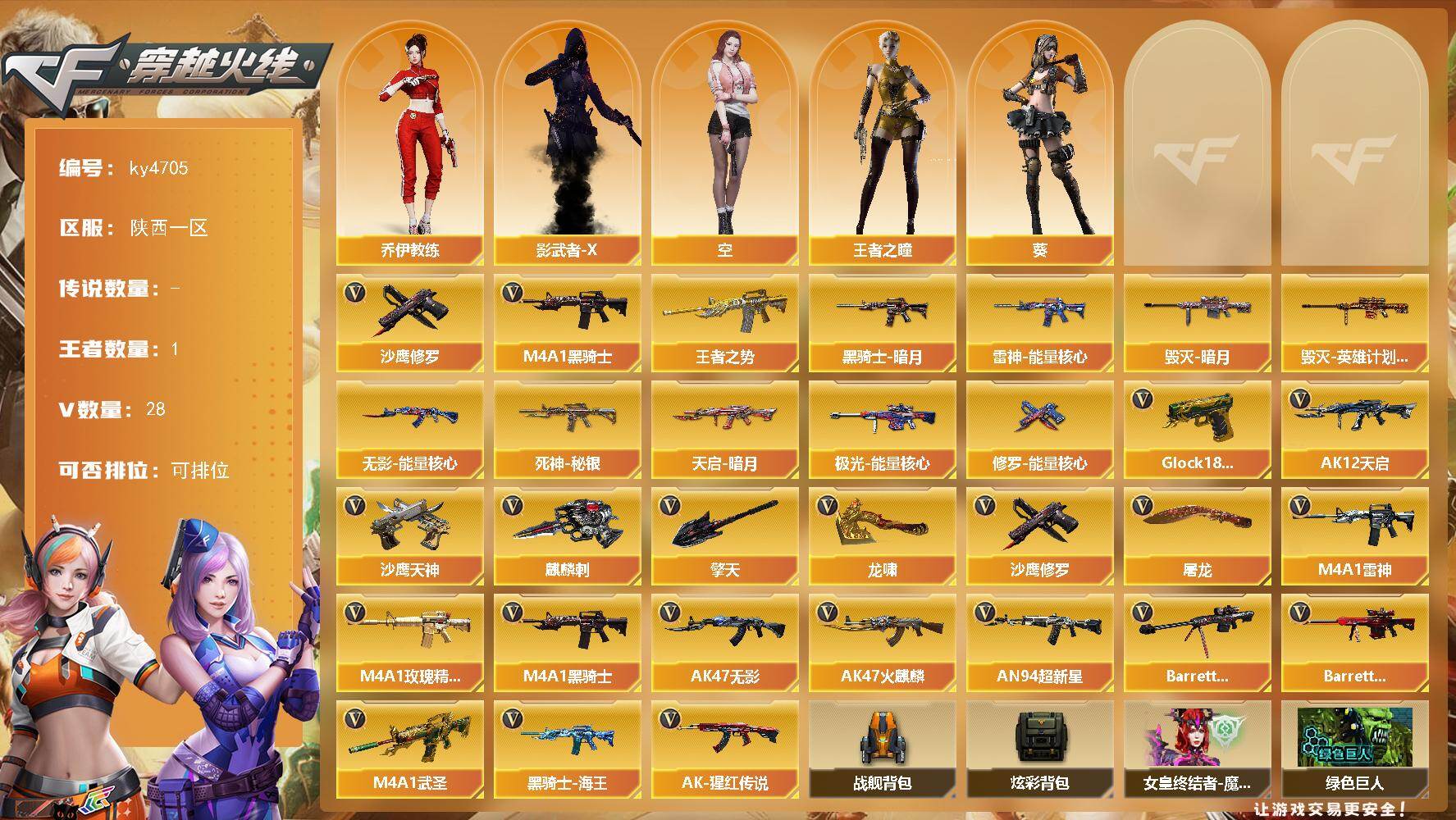 [17994596]【ky4705】陕西一区-28V-1王者-0炫金 【热门武器】:M4A1-黑骑士*2,沙鹰-修罗*2 【王者炫金武器】:王者之势 【皮肤】:雷神-能量核心,毁灭-暗月,毁灭-英雄计划 皮肤,黑骑士-暗月,无影-能量核心,死神-秘银,天启-暗月,极光-能量核心,修罗-能量核心 【角色】:葵,王者之瞳,乔伊教练,空,影武者-X 【英雄级武器】:AK47-火麒麟,M4A1-雷神,M4A1-黑骑士*2,AK47-无影,AK12-天启,AN94-超新星*2,M4A1-武圣*2,M4A1-玫瑰精灵,AK-47-猩红传说,黑骑士-海王,Barrett-毁灭,Barrett-极光,沙鹰-修罗*2,沙鹰-天神*2,Glock18-武圣,屠龙*2,龙啸,擎天,麒麟刺*2 【道具】:战舰背包,炫彩背包,女皇终结者-魔龙之吻,绿色巨人,灵魂忍者,迷雾幽灵,夺命之镰,防化服*2,流光-鎏金之域,防弹头盔*2,防弹衣*2,C4工具钳*2,手雷包*2 【特殊枪械】:2黑骑士