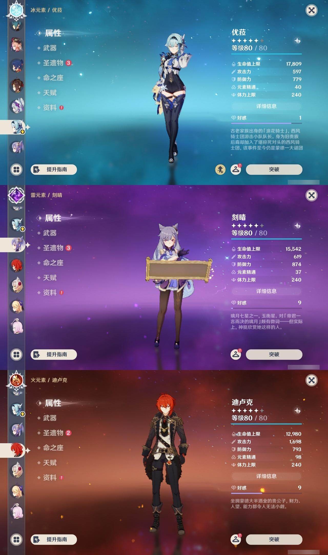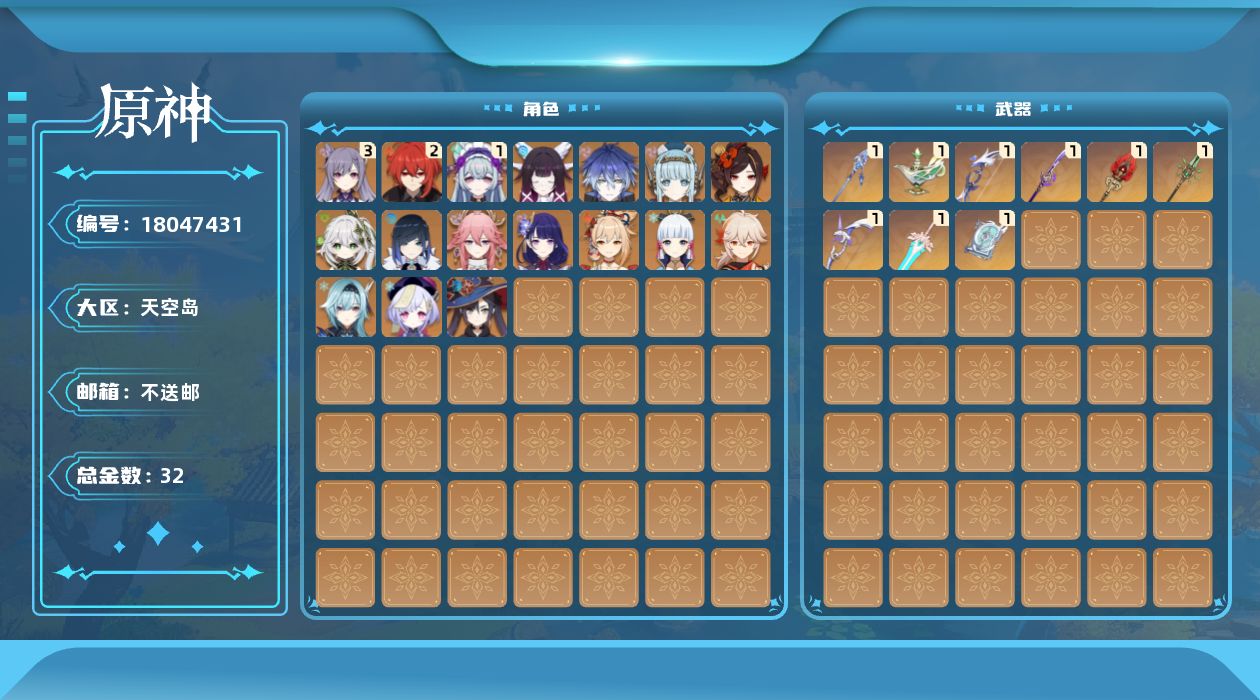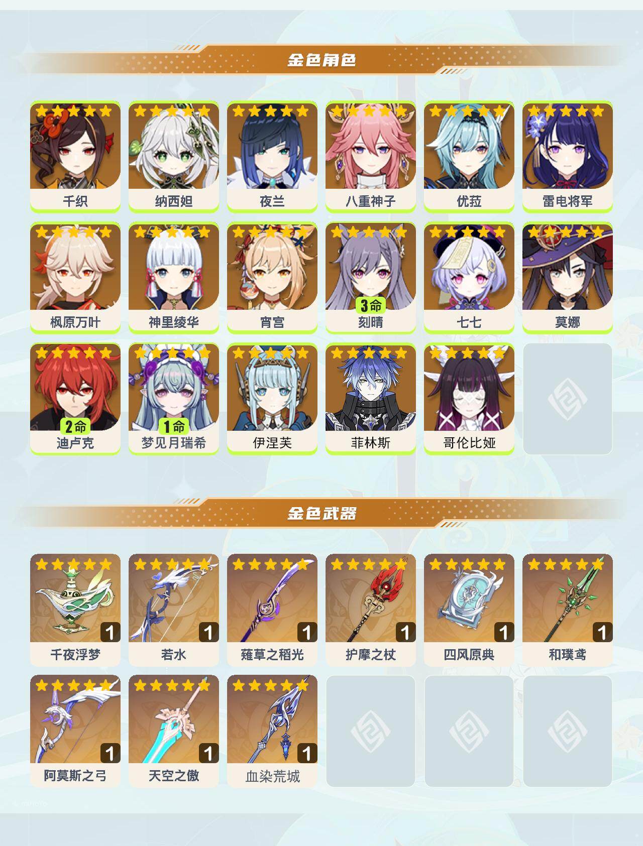 0命千织,0命纳西妲,0命夜兰,0命八重神子,0命优菈,0命雷电将军,0命枫原万叶,0命神里绫华,0命宵宫,3命刻晴,0命七七,0命莫娜,2命迪卢克,1命梦见月瑞希,0命伊涅芙,0命菲林斯,0命哥伦比娅,精1千夜浮梦,精1若水,精1薙草之稻光,精1护摩之杖,精1四风原典,精1和璞鸢,精1阿莫斯之弓,精1天空之傲,精1血染荒城