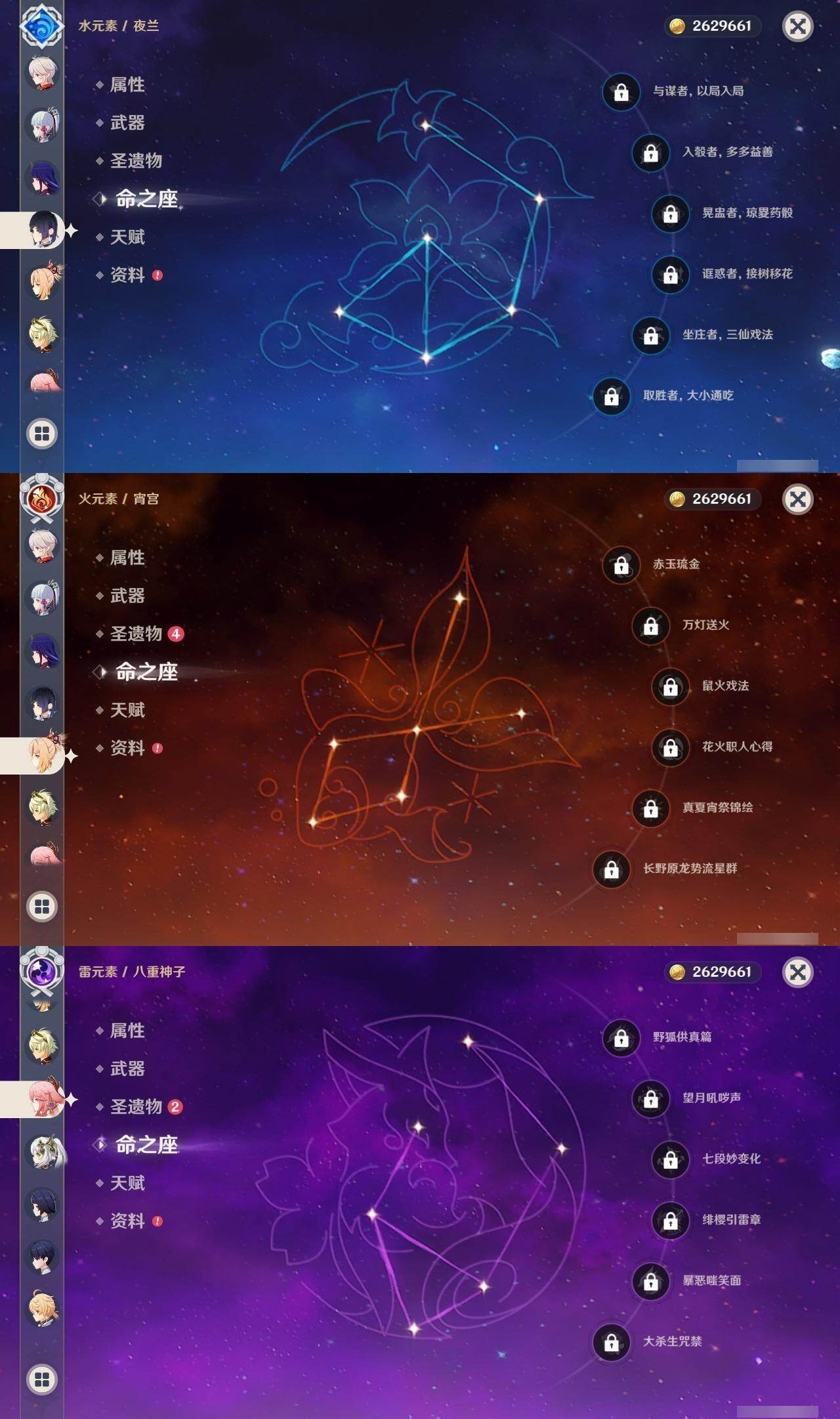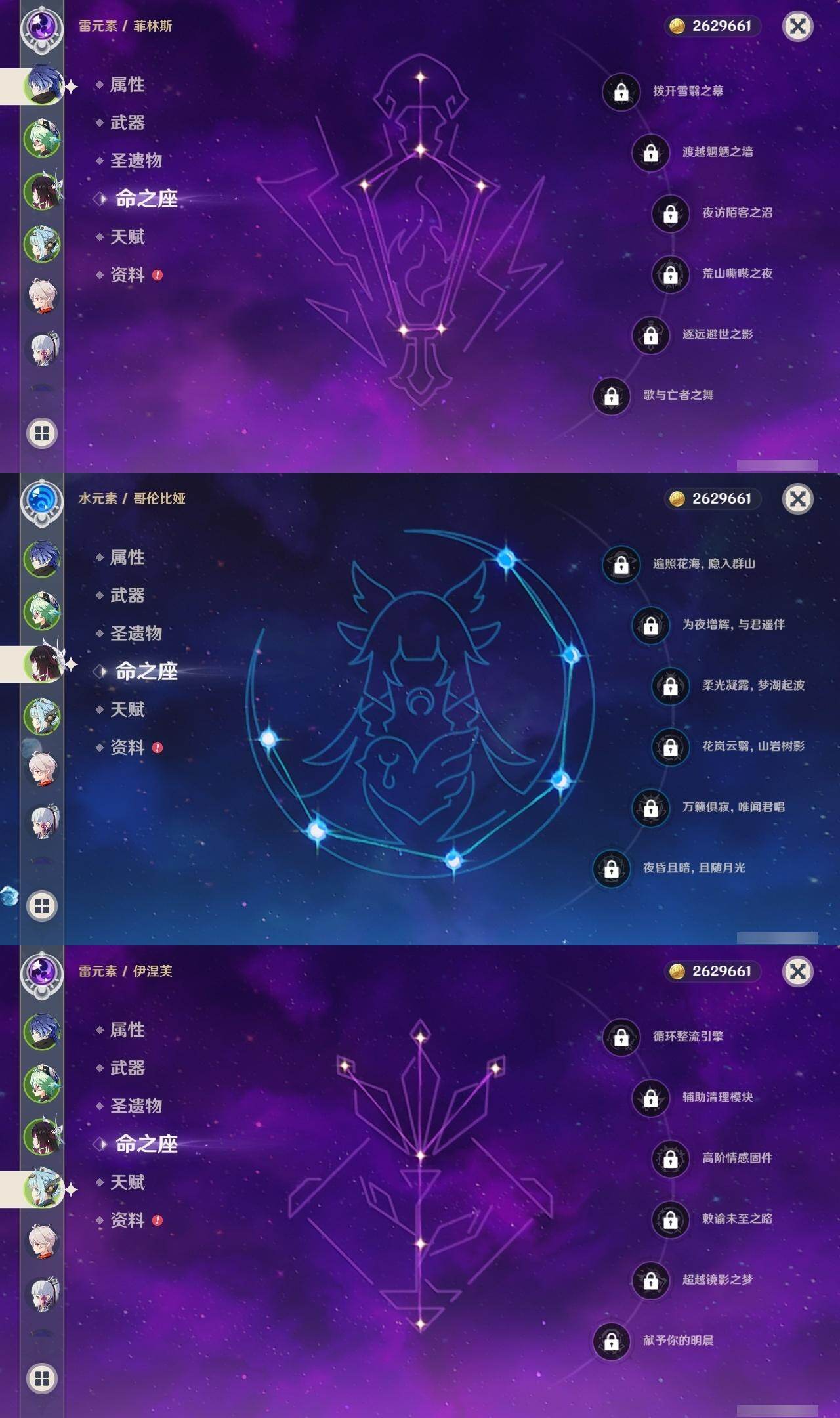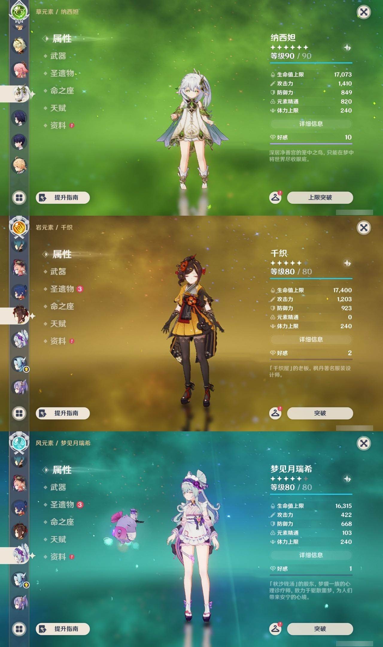 0命千织,0命纳西妲,0命夜兰,0命八重神子,0命优菈,0命雷电将军,0命枫原万叶,0命神里绫华,0命宵宫,3命刻晴,0命七七,0命莫娜,2命迪卢克,1命梦见月瑞希,0命伊涅芙,0命菲林斯,0命哥伦比娅,精1千夜浮梦,精1若水,精1薙草之稻光,精1护摩之杖,精1四风原典,精1和璞鸢,精1阿莫斯之弓,精1天空之傲,精1血染荒城