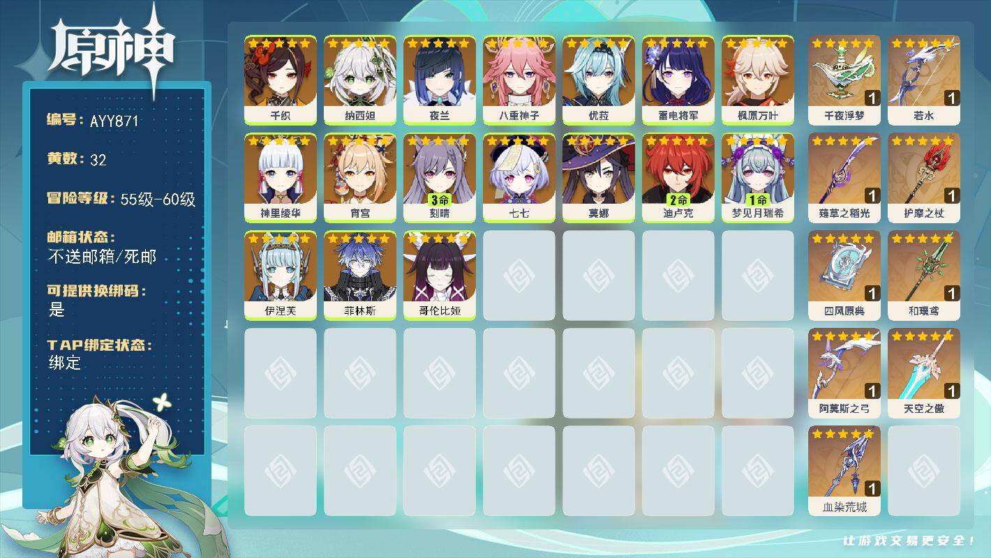 [18047431]59级/32黄/男主/17个五星角色/9个五星武器 0命千织,0命纳西妲,0命夜兰,0命八重神子,0命优菈,0命雷电将军,0命枫原万叶,0命神里绫华,0命宵宫,3命刻晴,0命七七,0命莫娜,2命迪卢克,1命梦见月瑞希,0命伊涅芙,0命菲林斯,0命哥伦比娅,精1千夜浮梦,精1若水,精1薙草之稻光,精1护摩之杖,精1四风原典,精1和璞鸢,精1阿莫斯之弓,精1天空之傲,精1血染荒城