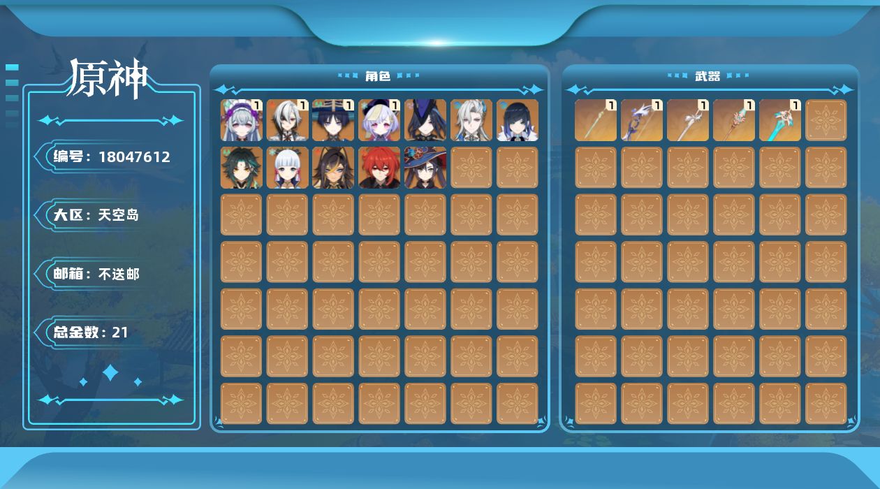 0命克洛琳德,1命阿蕾奇诺,0命那维莱特,0命迪希雅,1命流浪者,0命夜兰,0命神里绫华,0命魈,1命七七,0命莫娜,0命迪卢克,1命梦见月瑞希,精1若水,精1天空之脊,精1天空之刃,精1风鹰剑,精1朏魄含光