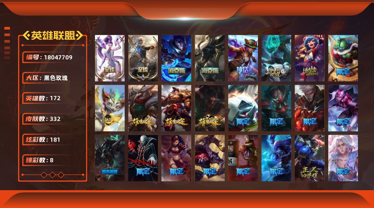 [18047709]黄金段位-172英雄-332皮肤-181炫彩-0终极-8神话-44限定-27传说-74史诗