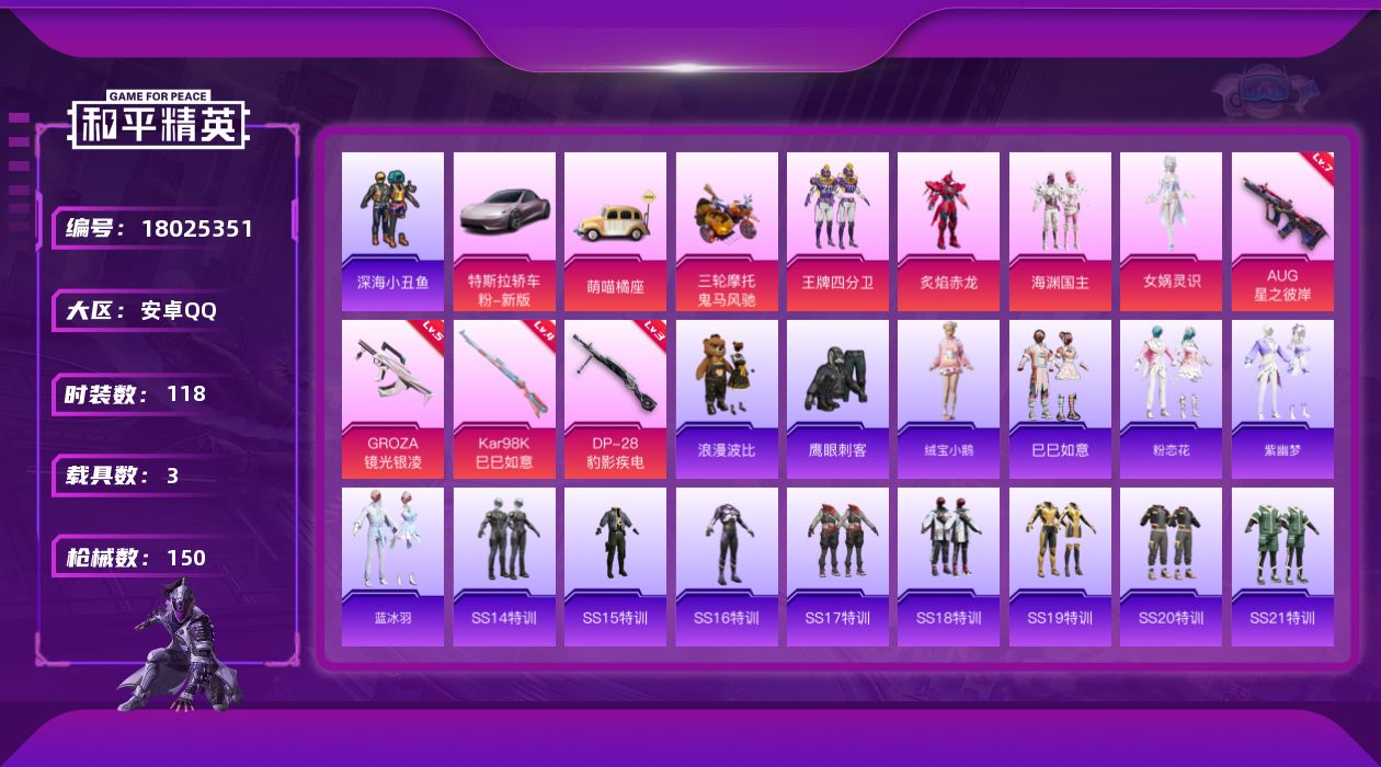 [18025351]安卓 手Q-4粉装-4特效枪-3载具-1粉色飞行器-50225热力值-7王牌印记-118套装-150枪皮【热门品类】:套装-深海小丑鱼,套装-浪漫波比【粉色套装】:粉装-王牌四分卫,粉装-炙焰赤龙,粉装-海渊国主,角色-女娲灵识【粉色枪皮等级】:GROZA-镜光银凌(五级),AUG-星之彼岸(七级),Kar98K-巳巳如意(四级),DP-28-豹影疾电(三级)【粉色载具】:特斯拉Roadster(沁心粉),萌喵橘座,鬼马风驰【粉色枪皮】:GROZA-镜光银凌,AUG-星之彼岸,Kar98K-巳巳如意,DP-28-豹影疾电【粉色飞行器】:夏日绵绵冰飞行器