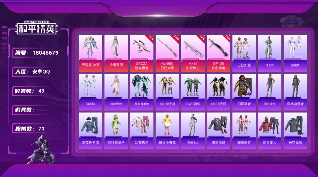 [18046679]安卓 手Q-2粉装-5特效枪-0载具-1粉色飞行器-20822热力值-1王牌印记-43套装-70枪皮 【粉色套装】:角色-天鹅座 冰河,角色-冷漠罗丽 【粉色枪皮等级】:GROZA-镜光银凌(五级),Kar98K-巳巳如意(五级),Mk14-甜梦熊击(五级),DP-28-豹影疾电(四级),PKM-萌骑夺宝(二级) 【粉色枪皮】:GROZA-镜光银凌,Kar98K-巳巳如意,Mk14-甜梦熊击,DP-28-豹影疾电,PKM-萌骑夺宝 【粉色飞行器】:炫彩糖果飞行器 【粉色降落伞】:星穹咏叹调降落伞,幻星舰长降落伞,冷漠罗丽降落伞,炫彩糖果降落伞 【稀有套装】:套装-巳巳如意,套装-炫彩糖果,角色-许七安,套装-紫幽梦,套装-蓝冰羽,角色-瑰梦爱神,套装-星影赞美诗,角色-月烬之祷 【稀有枪皮】:M79短管榴弹-钛晶裂爪,AUG-冰晶雪宝,M16A4-最终圣卫者,SCAR-L-玉兔迎春,M416-蓝色火焰,AUG-天降萌叽,M762-天降萌叽,M762-彩虹符号,G36C-星穹咏叹调,AC-VAL-天降萌叽,蜜獾-天降萌叽,UZI-天降萌叽,Vector-暗夜玫瑰,P90-巳巳如意,Kar98k-最终圣卫者,M24-歌者泠鸢,SKS-炫彩节奏,Mini14-炫彩节奏,S686-彩虹符号,S686-生命誓言,S686-巳巳如意,DBS-月影灵韵,M249-糯团青竹,M249-绯穹魔姬,DP-28-彩虹符号,MG3-幻世战舞者,短管霰弹-星穹咏叹调,蝎式手枪-千金淑猫,战术弩-江南烟雨,破片手榴弹-绯果甜心,破片手榴弹-巳巳如意 【其他套装】:套装-SS19特训,套装-SS21特训,套装-SS27特训,套装-幻影武者,套装-春日漫步,套装-森林游猎者,套装-湖蓝色名流,套装-特种颜团子,套装-甜蜜告白,套装-破蛋小黄鸡,套装-竞技名士,套装-绮丽涂鸦,套装-耀粉歌者,套装-街头潮人,套装-长空猛禽,套装-阳光火鸡,套装-青玉碎影,套装-魅力单车,套装-黄色伏地魔,套装-黑色伏地魔 【营地ID】:1027261247