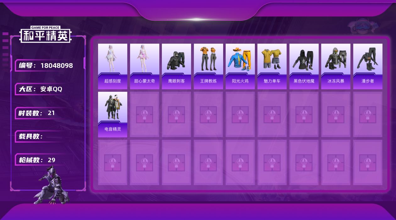 [18048098]安卓 手Q-0粉装-2特效枪-0载具-0粉色飞行器-7377热力值-1王牌印记-21套装-29枪皮