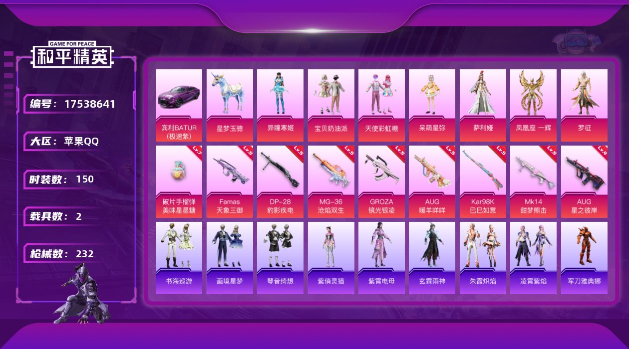 [17538641]苹果 手Q-1神装-9粉装-13特效枪-2载具-4粉色飞行器-70261热力值-8王牌印记-150套装-232枪皮