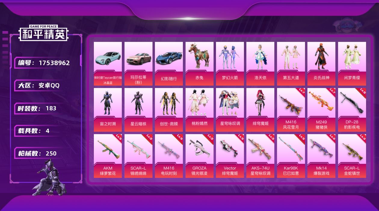 [17538962]安卓 手Q-11粉装-15特效枪-4载具-5粉色飞行器-84446热力值-11王牌印记-183套装-250枪皮 【热门品类】:粉装-梦幻火箭,套装-浪漫天命,角色-忠猛周仓,角色-忠真马岱,角色-忠义严颜,套装-龟仙人,套装-潮萌小黄鸭,套装-红红火火,角色-8号机,角色-Mark.06,大砍刀-青龙偃月刀,撬棍-龙胆亮银枪 【粉色套装】:粉装-梦幻火箭,角色-洛天依,粉装-第五大道,粉装-炎氏战神,粉装-闲梦青缨,角色-宙之时溯,角色-星云暗核,套装-创世·救赎,粉装-桃粉嫣然,粉装-星穹咏叹调,角色-绯穹魔姬 【粉色枪皮等级】:AKM-绿萝繁花(五级),SCAR-L-锦绣绵绵(五级),SCAR-L-金蛇镇世(三级),M416-风花雪月(七级),M416-电玩时刻(五级),GROZA-镜光银凌(五级),UMP45-萌骑冒险(四级),Vector-绯穹魔姬(五级),AKS-74U-星穹咏叹调(五级),Kar98K-巳巳如意(五级),Mk14-爆裂游戏(四级),Mk14-福马献瑞(五级),M249-猪猪侠(七级),DP-28-豹影疾电(五级) 【粉色载具】:玛莎拉蒂Ghibli(粉),保时捷Taycan 旅行版(冰晶蓝),幻影随行,赤兔 【粉色枪皮】:AKM-绿萝繁花,SCAR-L-锦绣绵绵,SCAR-L-金蛇镇世,M416-风花雪月,M416-电玩时刻,GROZA-镜光银凌,UMP45-萌骑冒险,Vector-绯穹魔姬,AKS-74U-星穹咏叹调,Kar98K-巳巳如意,Mk14-爆裂游戏,Mk14-福马献瑞,M249-猪猪侠,DP-28-豹影疾电,破片手榴弹-粉粉猫爪 【粉色飞行器】:镜域双华-灵镜之阶,万象金身飞行器,绯果甜心飞行器,飞天猪飞行器,云梦轻舟飞行器 【粉色降落伞】:快乐主宰降落伞,梦幻火箭降落伞,神秘黑猫降落伞,香水柠檬降落伞,恐龙拽拽降落伞,龙珠超降落伞,未来歌姬降落伞,闲梦青缨降落伞,萌物绒绒降落伞,莲影清波降落伞,龙行天下降落伞,沙丘之主降落伞,猪猪侠降落伞,精灵梦叶罗丽降落伞,忍者神龟降落伞,未来领航者降落伞,临安公主降落伞,鬼刀降落伞,樱桃泡泡降落伞,星穹咏叹调降落伞,冷漠罗丽降落伞,绯穹魔姬降落伞,喜羊羊与灰太狼降落伞,暮色玫影降落伞,辉云木星降落伞 【稀有套装】:套装-龟仙人,套装-巳巳如意,套装-马上来财,套装-雏菊兔兔,套装-萝