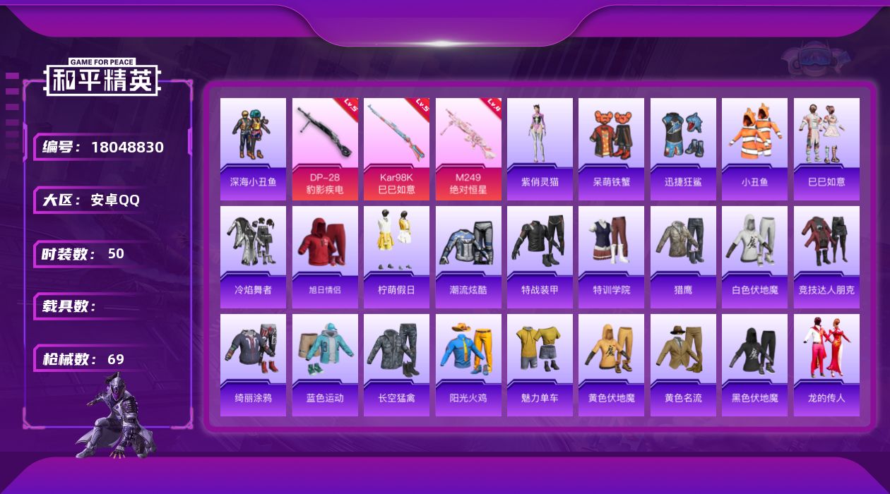 [18048830]安卓 手Q-0粉装-5特效枪-0载具-2粉色飞行器-18534热力值-3王牌印记-50套装-69枪皮 【热门品类】:套装-深海小丑鱼,套装-小丑鱼 【粉色枪皮等级】:UMP45-萌骑冒险(四级),Kar98K-巳巳如意(五级),Mk14-福马献瑞(五级),M249-绝对恒星(四级),DP-28-豹影疾电(五级) 【粉色枪皮】:UMP45-萌骑冒险,Kar98K-巳巳如意,Mk14-福马献瑞,M249-绝对恒星,DP-28-豹影疾电 【粉色飞行器】:绝对恒星飞行器,炫彩糖果飞行器 【粉色降落伞】:绝对恒星降落伞,梦幻火箭降落伞,异瞳寒姬降落伞,炫彩糖果降落伞 【稀有套装】:套装-巳巳如意,套装-雪国风尚,套装-炫彩糖果,套装-马上有钱,套装-迅捷龙虾,角色-紫俏灵猫,套装-雨过天青,套装-红釉青花 【稀有枪皮】:AUG-冰晶雪宝,AKM-缤纷海域,SCAR-L-玉兔迎春,M416-蓝色火焰,Famas-霜月狼主,Vector-生命誓言,汤姆逊-天降萌叽,汤姆逊-耀粉歌者,汤姆逊-像素花束,P90-巳巳如意,Kar98K-红色方程式,SKS-炫彩节奏,SKS-迅猛狂鲨,Mini14-耀粉歌者,S686-巳巳如意,S12K-玩趣呆呆,S12K-极意拳锋,MG3-幻世战舞者,突击盾牌-绝对恒星 【其他套装】:套装-冷焰舞者,套装-旭日情侣,套装-柠萌假日,套装-潮流炫酷,套装-特战装甲,套装-特训学院,套装-猎鹰,套装-白色伏地魔,套装-竞技达人朋克,套装-绮丽涂鸦,套装-蓝色运动,套装-长空猛禽,套装-阳光火鸡,套装-魅力单车,套装-黄色伏地魔,套装-黄色名流,套装-黑色伏地魔,套装-龙的传人,套装-漫步者,套装-深海小丑鱼,套装-呆萌铁蟹,套装-迅捷狂鲨,套装-弄潮海豚,套装-冰川特警,套装-众神之王 【稀有头盔】:深海小丑鱼头盔(2级),深海小丑鱼头盔(1级) 【稀有背包】:深海小丑鱼背包(3级),深海小丑鱼背包(2级),深海小丑鱼背包(1级) 【营地ID】:1027741784