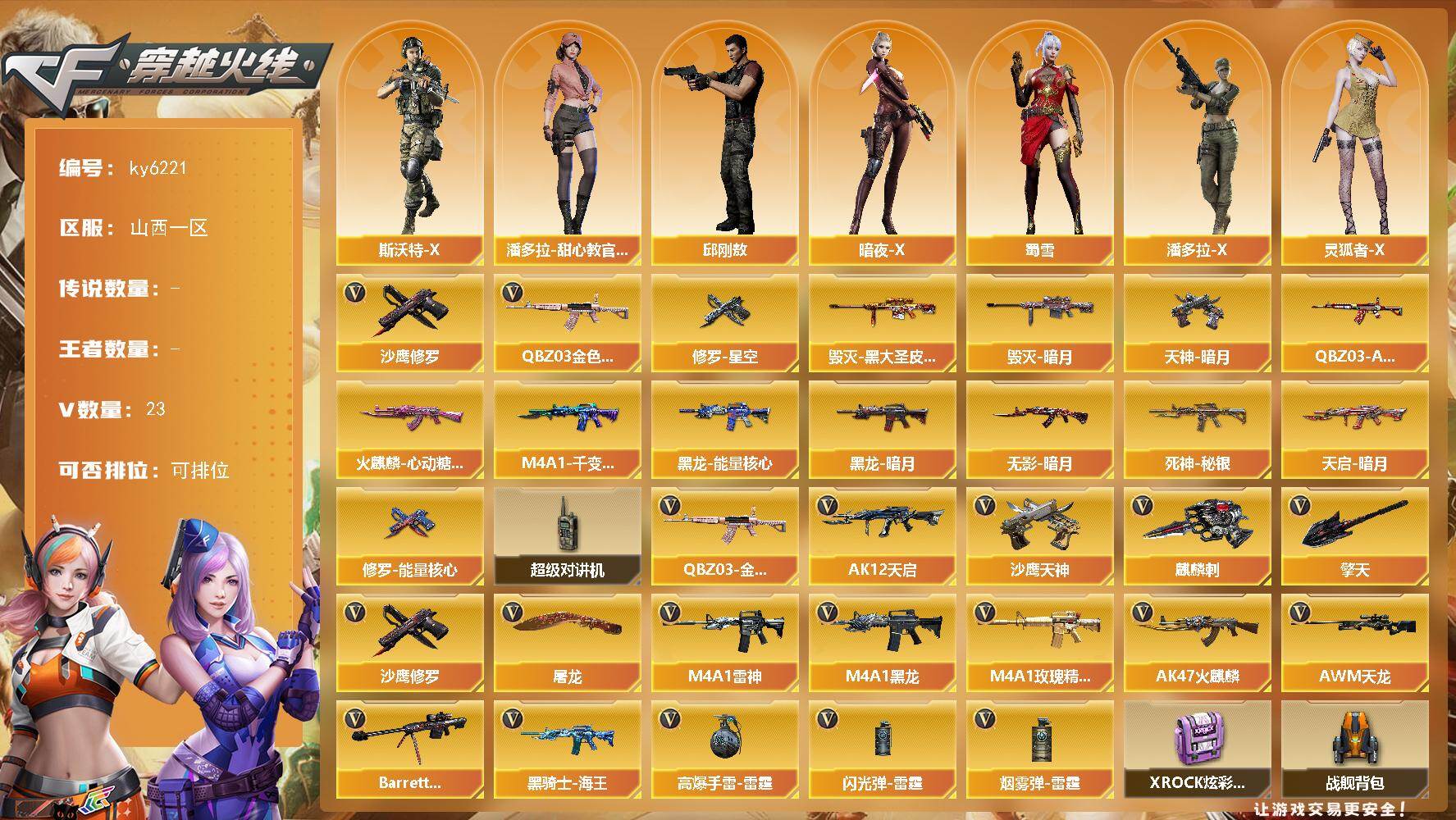 [18052181]【ky6221】山西一区-23V-0王者武器数-0炫金武器数 【热门武器】:QBZ03-金色蔷薇,沙鹰-修罗*2 【皮肤】:QBZ03-AG-CFPLS19冠军,火麒麟-心动糖果,毁灭-暗月*2,毁灭-黑大圣皮肤,M4A1-千变-孔明皮肤,黑龙-能量核心,黑龙-暗月,无影-暗月*2,死神-秘银,天启-暗月,修罗-能量核心,修罗-星空,天神-暗月*3 【角色】:零,暗夜-X,灵狐者-X,潘多拉-X,潘多拉-甜心教官,邱刚敖,斯沃特-X,蜀雪,影武者-X 【暴走生化】:超级对讲机 【英雄级武器】:AK47-火麒麟*2,M4A1-黑龙,M4A1-雷神,AK12-天启,M4A1-玫瑰精灵,QBZ03-金色蔷薇,黑骑士-海王*2,AWM-天龙,Barrett-毁灭,沙鹰-修罗*2,沙鹰-天神,屠龙,擎天,麒麟刺,高爆手雷-雷霆,闪光弹-雷霆,烟雾弹-雷霆 【道具】:XROCK炫彩背包,战舰背包,夺命之镰,防化服,金色流光-枪王排位*2,枪王排位28赛季金色流光,防弹头盔*2,防弹衣*2,C4工具钳*3,手雷包*3 【特殊枪械】: