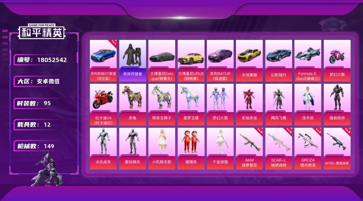 [18052542]可二次【特价出售/店主推荐】安卓 微信-10粉装-7特效枪-12载具-10粉色飞行器-62726热力值-3王牌印记-95套装-149枪皮【红色载具】:宾利欧陆GT敞篷(深空蓝)(一级)【热门品类】:粉装-梦幻火箭,套装-奇异狩猎者,角色-忠猛周仓,角色-忠真马岱,角色-忠义严颜,大砍刀-青龙偃月刀,撬棍-龙胆亮银枪【粉色套装】:粉装-梦幻火箭,粉装-炙焰赤龙,粉装-飓风飞鹰,角色-洛天依,角色-熔岩统帅,角色-冰炎战车,角色-紫钛骑兵,角色-小叽联名款,玩偶服-猪猪侠,角色-千金淑猫【粉色枪皮等级】:AKM-绿萝繁花(五级),SCAR-L-锦绣绵绵(五级),M416-墨龙九天(三级),GROZA-镜光银凌(五级),M762-青锋波束(五级),Kar98K-巳巳如意(五级),MG3-洛神天依(五级)【粉色载具】:宾利欧陆GT敞篷(深空蓝),兰博基尼Estoque(银翼灰),兰博基尼URUS(明艳黄),宾利BATUR(极速紫),永恒黄蜂,幻影随行,Formula E Gen2(巅峰兰),双人摩托-梦幻火箭,杜卡迪 Panigale V4(杜卡迪红),赤兔,照夜玉狮子,星梦玉骢【粉色枪皮】:AKM-绿萝繁花,SCAR-L-锦绣绵绵,M416-墨龙九天,GROZA-镜光银凌,M762-青锋波束,Kar98K-巳巳如意,MG3-洛神天依【粉色飞行器】:酣梦熊熊飞行器,梦幻火箭飞行器,古战神甲飞行器,熔岩统帅飞行器,沙丘之主天马,镜域双华-灵镜之阶,辉耀战甲飞行器,龙翔九天飞行器,幽焰列车飞行器,圣域金龙飞行器