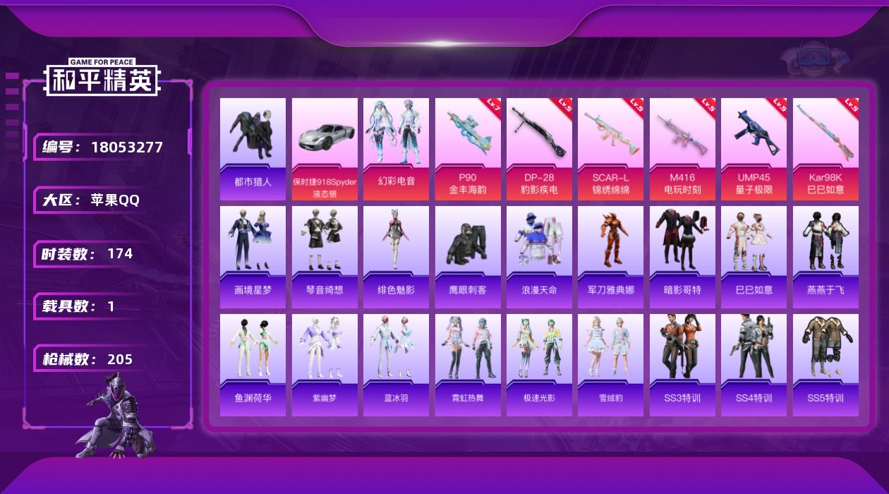[18053277]苹果 手Q-无敌战神框-2粉装-7特效枪-1载具-0粉色飞行器-60673热力值-13王牌印记-174套装-205枪皮 【热门品类】:套装-浪漫天命,套装-都市猎人,角色-军刀雅典娜,套装-暗影哥特 【粉色套装】:粉装-幻彩电音,角色-虎痴许褚 【粉色枪皮等级】:SCAR-L-锦绣绵绵(五级),M416-电玩时刻(五级),UMP45-量子极限(五级),P90-金丰海韵(七级),Kar98K-巳巳如意(五级),Mk14-福马献瑞(五级),DP-28-豹影疾电(五级) 【粉色载具】:保时捷918 Spyder(液态银) 【粉色枪皮】:SCAR-L-锦绣绵绵,M416-电玩时刻,UMP45-量子极限,P90-金丰海韵,Kar98K-巳巳如意,Mk14-福马献瑞,DP-28-豹影疾电 【粉色降落伞】:极限特训降落伞,幻影战神降落伞,神秘黑猫降落伞,暗夜玫瑰降落伞,暗夜鎏金降落伞,精灵梦叶罗丽降落伞,幻彩电音降落伞,无垠阁降落伞,炫彩糖果降落伞 【稀有套装】:套装-巳巳如意,套装-马上有钱,套装-燕燕于飞,套装-鱼渊荷华,套装-紫幽梦,套装-蓝冰羽,套装-霓虹热舞,套装-极速光影,套装-雪绒豹,角色-绯色魅影,套装-画境星梦,套装-琴音绮想,角色-月烬之祷,套装-雨过天青,套装-红釉青花 【稀有枪皮】:AKM-夜灯,AKM-奇异狩猎者,AKM-彩虹符号,AKM-星之彼岸,AKM-灼热熔岩,AKM-生命誓言,AKM-破晓战魂,AKM-萌趣颜团子,AKM-虎虎生威,AKM-霓虹街区,M16A4-幻世战舞者,M16A4-甜心亚梦,M16A4-红色方程式,M16A4-蓝色火焰,SCAR-L-夜灯,SCAR-L-炫彩节奏,SCAR-L-玉兔迎春,SCAR-L-红色方程式,SCAR-L-黄金龙骨,M416-动感兔斯基,M416-夜灯,M416-糯团青竹,M416-红色方程式,M416-蓝色火焰,GROZA-彩虹符号,GROZA-田园牧歌,AUG-天降萌叽,AUG-耀粉歌者,QBZ-彩虹符号,QBZ-飞驰魅影,M762-天降萌叽,M762-牛气冲天,M762-瑞龙福将,M762-云朵鹅,Mk47-妙红点点,AC-VAL-天降萌叽,AC-VAL-彩虹甜喵,AC-VAL-甜心亚梦,蜜獾-垂柳戏鸭,蜜獾-天降萌叽,蜜獾-娇憨猪猪,蜜獾-虎痴许褚,ACE32-画境星梦,UZI-天降萌叽,UZI-