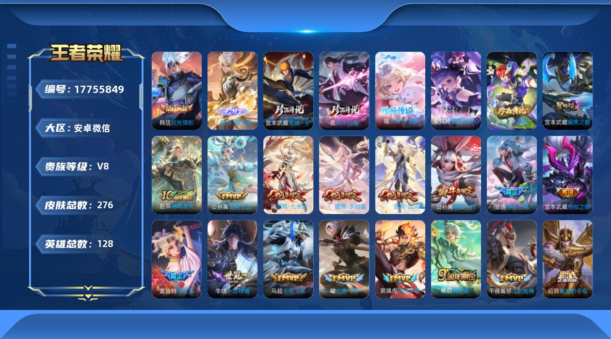 [17755849]安卓WX-V8-至尊星耀IV段位-128英雄-276皮肤-1典藏皮肤-1无双-5珍品传说-20传说-80史诗