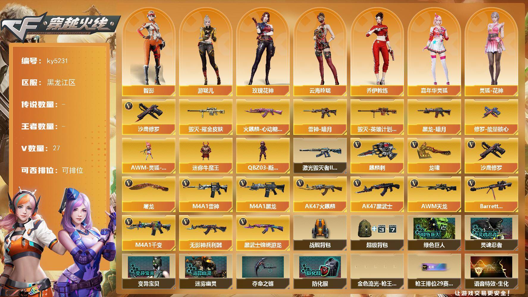 [18057569]【ky5231】黑龙江区-27V-0王者-0炫金 【热门武器】:沙鹰-修罗*2 【皮肤】:雷神-暗月,火麒麟-心动糖果,毁灭耀金皮肤,毁灭-英雄计划 皮肤,黑龙-暗月,修罗-能量核心 【角色】:乔伊教练,云海玲珑,芳心审判者,风暴女,嘉年华灵狐,灵狐-花神,麻雀,曼陀罗-X,曼陀罗-礼服,玫瑰花神,潘多拉-X,潘多拉-甜心教官,斯沃特-X,兔囡囡,游珑儿,智影 【人偶武器】:AWM-灵狐-15周年嘉年华,迷你牛魔王,QBZ03-斯沃特 【挑战大师】:激光毁灭者III-白马银枪 【英雄级武器】:M4A1-千变,AK47-火麒麟*3,M4A1-黑龙,M4A1-雷神,AK47-黑武士,无影-神兵利器,黑武士-锦绣游龙,AWM-天龙*2,Barrett-毁灭,沙鹰-修罗*2,屠龙*3,龙啸,麒麟刺 【道具】:战舰背包,超级背包,绿色巨人,灵魂忍者*2,变异宝贝,迷雾幽灵*2,夺命之镰,防化服*2,金色流光-枪王排位*2,枪王排位28赛季金色流光,枪王排位29赛季金色流光,语音特效-生化,云海游龙表情,防弹头盔*4,防弹衣*4,C4工具钳*3,手雷包*3 【特殊枪械】: