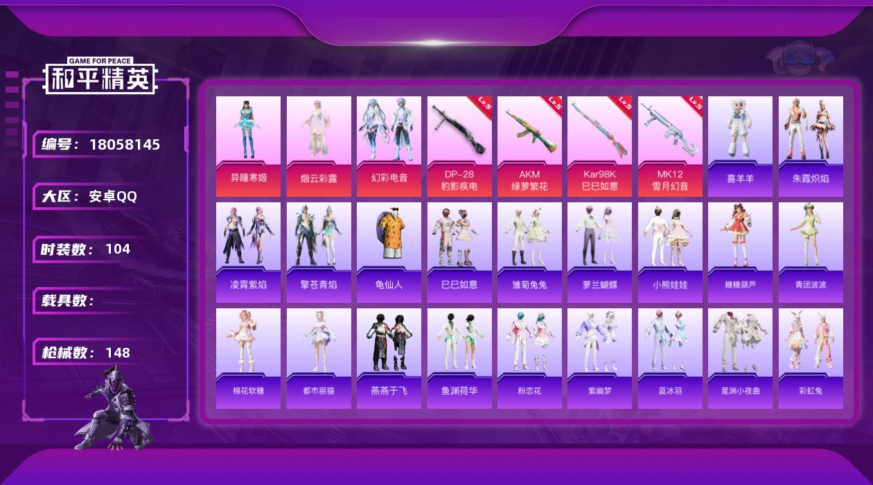[18058145]【特价出售/店主推荐】安卓 手Q-3粉装-6特效枪-0载具-1粉色飞行器-46921热力值-11王牌印记-104套装-148枪皮 【热门品类】:套装-龟仙人 【粉色套装】:角色-烟云彩露,粉装-幻彩电音,角色-异瞳寒姬 【粉色枪皮等级】:AKM-绿萝繁花(五级),ACE32-萌骑漫游(五级),Kar98K-巳巳如意(五级),Mk14-福马献瑞(一级),MK12-雪月幻音(五级),DP-28-豹影疾电(五级) 【粉色枪皮】:AKM-绿萝繁花,ACE32-萌骑漫游,Kar98K-巳巳如意,Mk14-福马献瑞,MK12-雪月幻音,DP-28-豹影疾电 【粉色飞行器】:炫彩糖果飞行器 【粉色降落伞】:江南烟雨降落伞,精灵梦叶罗丽降落伞,守护天翼降落伞,千金淑猫降落伞,圣域龙灵降落伞,智耀战神降落伞,星穹咏叹调降落伞,荧海星豚降落伞,炫彩糖果降落伞 【稀有套装】:套装-龟仙人,套装-巳巳如意,套装-炫彩糖果,套装-迅捷龙虾,套装-雏菊兔兔,套装-萝兰蝴蝶,套装-小熊娃娃,套装-糖糖葫芦,套装-青团波波,套装-棉花软糖,角色-都市丽猫,套装-燕燕于飞,套装-鱼渊荷华,套装-粉恋花,套装-紫幽梦,套装-蓝冰羽,套装-星渊小夜曲,套装-彩虹兔,套装-云朵鹅,套装-雪绒豹,套装-朱霞炽焰,套装-凌霄紫焰,套装-擎苍青焰,玩偶服-喜羊羊 【稀有枪皮】:AUG-冰晶雪宝,AKM-江南烟雨,AKM-破晓战魂,AKM-龙的传人,M16A4-莲影清波,M16A4-千金淑猫,SCAR-L-夜灯,SCAR-L-暗夜玫瑰,SCAR-L-炫彩节奏,SCAR-L-红色方程式,M416-糯团青竹,M416-红色方程式,GROZA-荧海星豚,AUG-2P战斗服款,AUG-天降萌叽,M762-天降萌叽,M762-云朵鹅,蜜獾-天降萌叽,ARX-凌霄紫焰,UZI-啾咪啾咪,UZI-天降萌叽,UMP45-涂山之恋,UMP45-猪猪侠,Vector-焰鹰斗篷,Vector-暗夜玫瑰,Vector-生命誓言,汤姆逊-天降萌叽,汤姆逊-暗夜鎏金,汤姆逊-炫彩节奏,汤姆逊-像素花束,JS9-凌霄紫焰,P90-巳巳如意,Kar98K-彩虹符号,Kar98K-星穹咏叹调,AWM-焰鹰斗篷,VSS-彩虹符号,Mini14-耀粉歌者,SLR-彩虹符号,SVD-云朵鹅,S686-巳巳如意,S12K-玩趣呆呆,DBS-焰鹰斗篷,S