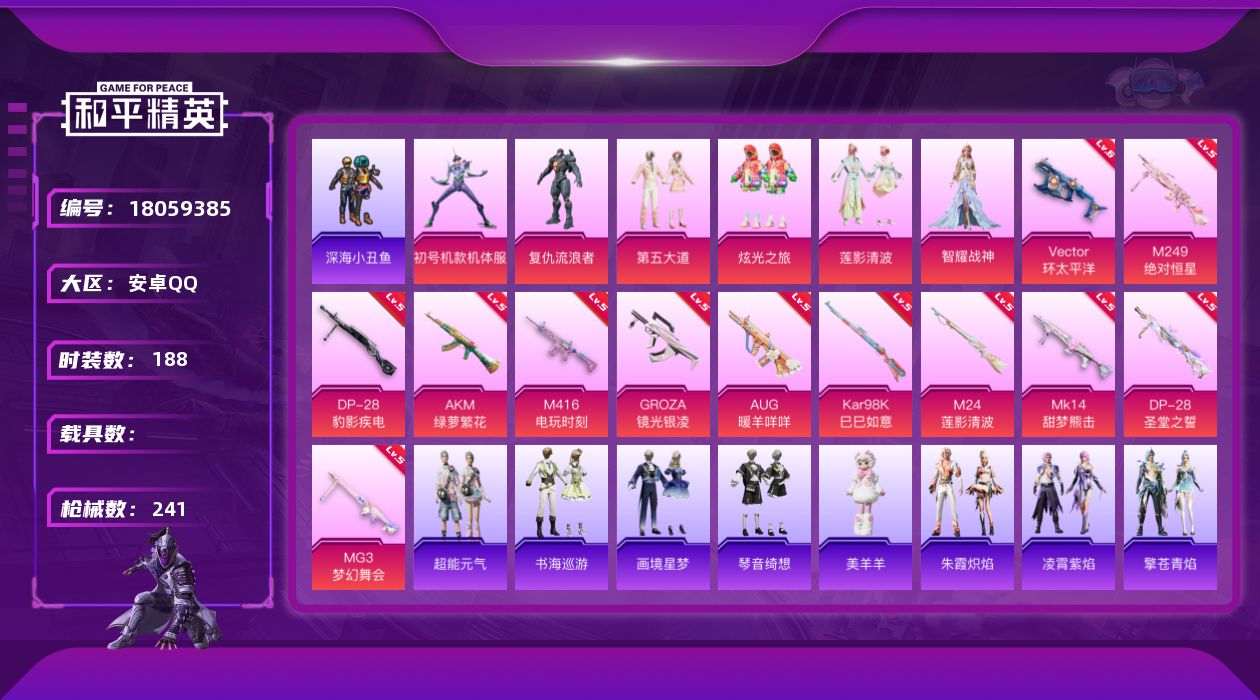 [18059385]安卓 手Q-6粉装-15特效枪-0载具-1粉色飞行器-73512热力值-6王牌印记-188套装-241枪皮 【热门品类】:套装-深海小丑鱼,套装-小丑鱼,角色-军刀雅典娜,套装-龟仙人,角色-Mark.06 【粉色套装】:角色-初号机款机体服,角色-复仇流浪者,粉装-第五大道,粉装-炫光之旅,粉装-莲影清波,角色-智耀战神 【粉色枪皮等级】:AKM-绿萝繁花(五级),M416-电玩时刻(五级),GROZA-镜光银凌(五级),AUG-暖羊咩咩(五级),ACE32-萌骑漫游(五级),Vector-环太平洋(六级),AKS-74U-森灵之息(五级),Kar98K-巳巳如意(五级),M24-莲影清波(五级),Mk14-甜梦熊击(五级),Mk14-福马献瑞(四级),M249-绝对恒星(五级),DP-28-圣堂之誓(五级),DP-28-豹影疾电(五级),MG3-梦幻舞会(五级) 【粉色枪皮】:AKM-绿萝繁花,M416-电玩时刻,GROZA-镜光银凌,AUG-暖羊咩咩,ACE32-萌骑漫游,Vector-环太平洋,AKS-74U-森灵之息,Kar98K-巳巳如意,M24-莲影清波,Mk14-甜梦熊击,Mk14-福马献瑞,M249-绝对恒星,DP-28-圣堂之誓,DP-28-豹影疾电,MG3-梦幻舞会 【粉色飞行器】:炫彩糖果飞行器 【粉色降落伞】:星之彼岸降落伞,环太平洋降落伞,天星战神降落伞,炫光之旅降落伞,圣堂之誓降落伞,星梦奇缘降落伞,千金淑猫降落伞,鬼刀降落伞,幻影飞狐降落伞,樱桃泡泡降落伞,智耀战神降落伞,星穹咏叹调降落伞,炫彩糖果降落伞,鸢尾珑雾降落伞 【稀有套装】:套装-龟仙人,套装-巳巳如意,套装-超能元气,套装-雪国风尚,套装-炫彩糖果,角色-X,套装-马上有钱,套装-火种守卫者,套装-糖糖葫芦,套装-青团波波,角色-俏兔智灵,套装-燕燕于飞,套装-鱼渊荷华,角色-蜜桃派对,套装-粉恋花,套装-紫幽梦,套装-蓝冰羽,角色-鲛海歌灵,套装-星影赞美诗,套装-朱霞炽焰,套装-凌霄紫焰,套装-擎苍青焰,玩偶服-美羊羊,套装-书海巡游,套装-画境星梦,套装-琴音绮想,套装-雨过天青,套装-红釉青花 【稀有枪皮】:AUG-冰晶雪宝,AKM-夜灯,AKM-江南烟雨,AKM-环太平洋,AKM-破晓战魂,AKM-萌趣颜团子,AKM-霓虹街区,AKM-龙的传人,M16A4-夜