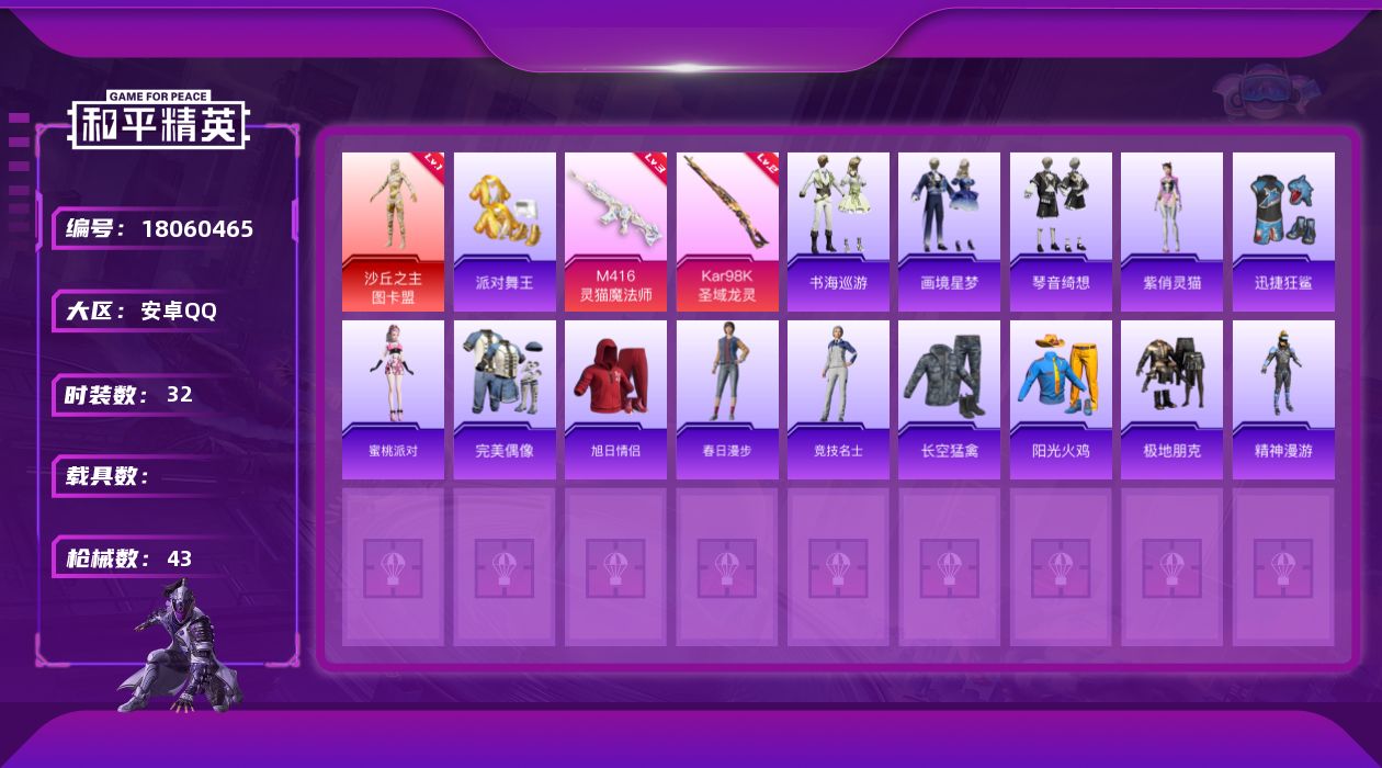 [18060465]安卓 手Q-2神装-1粉装-6特效枪-0载具-5粉色飞行器-18649热力值-2王牌印记-32套装-43枪皮 【红色神装等级】:暮色玫影-艾丽娅(一级),沙丘之主-图卡盟(一级) 【红色角色神装】:暮色玫影-艾丽娅,沙丘之主-图卡盟 【热门品类】:套装-派对舞王 【粉色套装】:角色-虹云熊熊 【粉色枪皮等级】:AKM-暮色玫影(三级),M416-灵猫魔法师(三级),UMP45-萌骑冒险(三级),AKS-74U-森灵之息(四级),Kar98K-圣域龙灵(二级),Mk14-福马献瑞(五级) 【粉色枪皮】:AKM-暮色玫影,M416-灵猫魔法师,UMP45-萌骑冒险,AKS-74U-森灵之息,Kar98K-圣域龙灵,Mk14-福马献瑞 【粉色飞行器】:香车宝马飞行器,幻海精灵飞行器,灵猫魔法师飞行器,暮色之舞飞行器 【粉色降落伞】:幻影战神降落伞,异瞳寒姬降落伞,暮色玫影降落伞 【稀有套装】:套装-马上有钱,套装-迅捷龙虾,角色-蜜桃派对,角色-紫俏灵猫,套装-书海巡游,套装-画境星梦,套装-琴音绮想,套装-雨过天青,套装-红釉青花,角色-幽雨猫猫 【稀有枪皮】:GROZA-暮色玫影,AUG-幻影战神,ACE32-画境星梦,UZI-幻影战神,汤姆逊-幻影战神,汤姆逊-像素花束,MP5K-画境星梦,Kar98K-幻影战神,M24-未来战士,M24-樱桃泡泡,AWM-暮色玫影,M1加兰德-画境星梦,DBS-彩虹甜喵,AA12-G-画境星梦,M249-沙丘之主,MG3-幻世战舞者,蝎式手枪-虹云熊熊,爆炸猎弓-花中眠,撬棍-暮色玫影,平底锅-画境星梦 【其他套装】:套装-完美偶像,套装-旭日情侣,套装-春日漫步,套装-竞技名士,套装-长空猛禽,套装-阳光火鸡,套装-极地朋克,套装-迅捷狂鲨,套装-精神漫游 【稀有头盔】:幻影战神头盔(2级),幻影战神头盔(1级),深海小丑鱼头盔(1级) 【稀有背包】:幻影战神背包(2级),深海小丑鱼背包(3级) 【营地ID】:1029551841