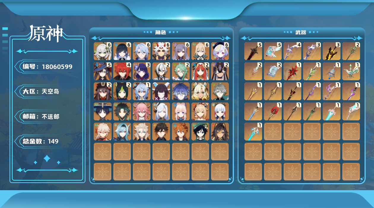 2命阿蕾奇诺,2命白术,0命迪希雅,0命艾尔海森,0命流浪者,满命纳西妲,2命妮露,2命赛诺,2命提纳里,满命夜兰,满命神里绫人,0命八重神子,0命申鹤,满命荒泷一斗,0命优菈,3命雷电将军,0命枫原万叶,0命神里绫华,0命钟离,2命胡桃,1命甘雨,0命魈,0命宵宫,0命温迪,0命达达利亚,0命阿贝多,0命珊瑚宫心海,满命刻晴,满命七七,满命琴,5命莫娜,4命迪卢克,0命希诺宁,0命菲林斯,0命哥伦比娅,精1赤月之形,精1裁叶萃光,精1图莱杜拉的回忆,精1千夜浮梦,精1赤沙之杖,精1圣显之钥,精3若水,精1赤角石溃杵,精1薙草之稻光,精1飞雷之弦振,精1雾切之回光,精1苍古自由之誓,精3无工之剑,精1护摩之杖,精1磐岩结绿,精2四风原典,精2和璞鸢,精2天空之脊,精1贯虹之槊,精1天空之翼,精4阿莫斯之弓,精1天空之刃,精5天空之卷,精5狼的末路,精1天空之傲