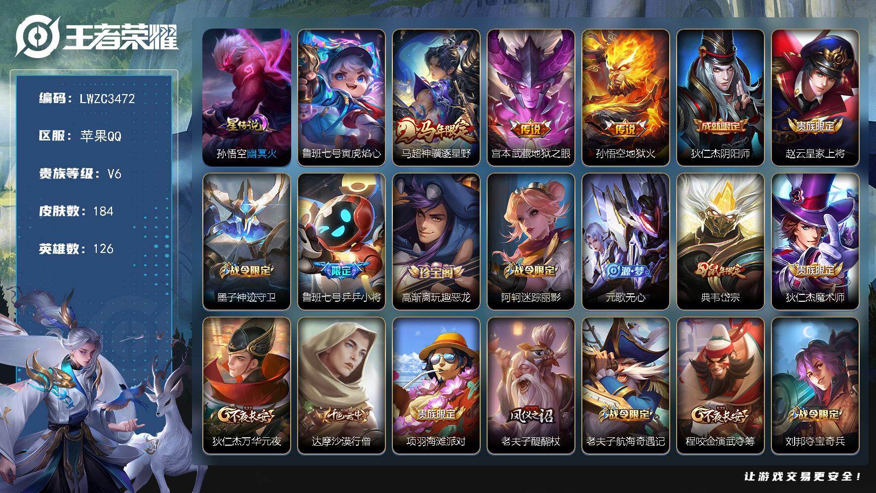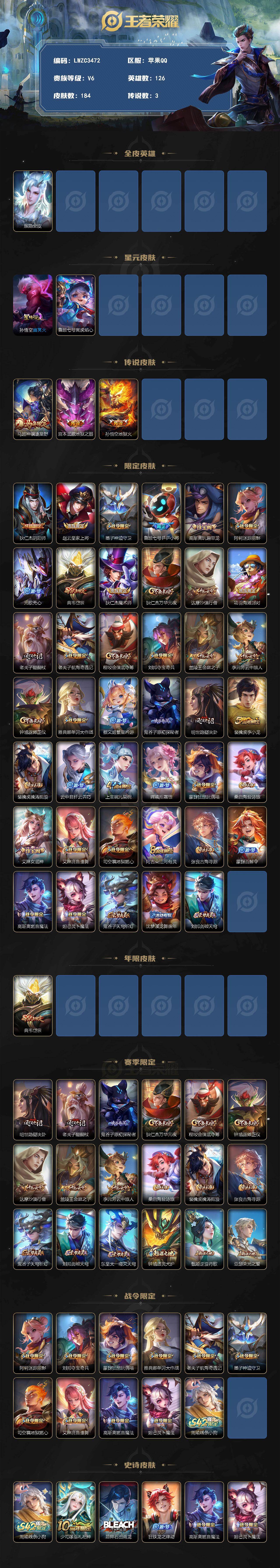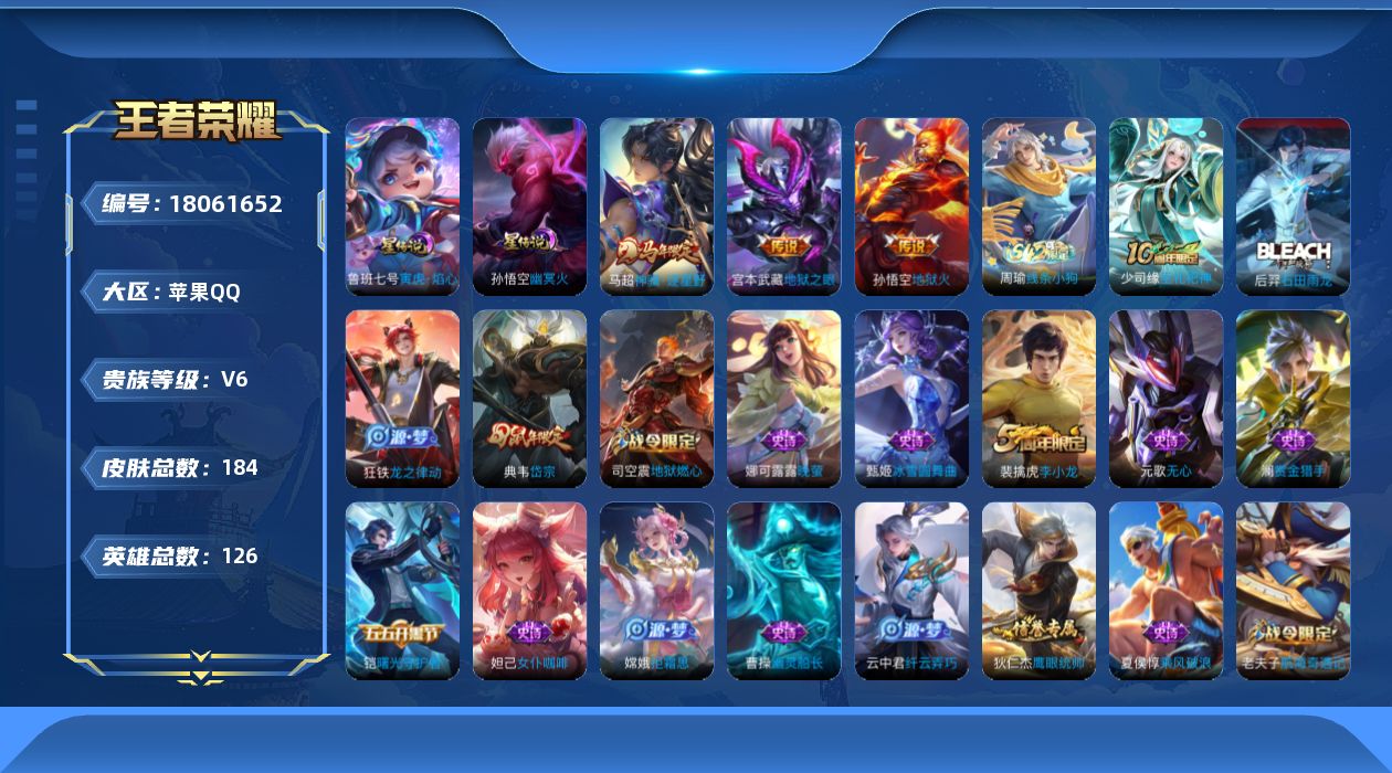 [18061652]【特价出售/店主推荐】苹果Q-V6-最强王者段位-126英雄-184皮肤-3传说-43史诗-2星元