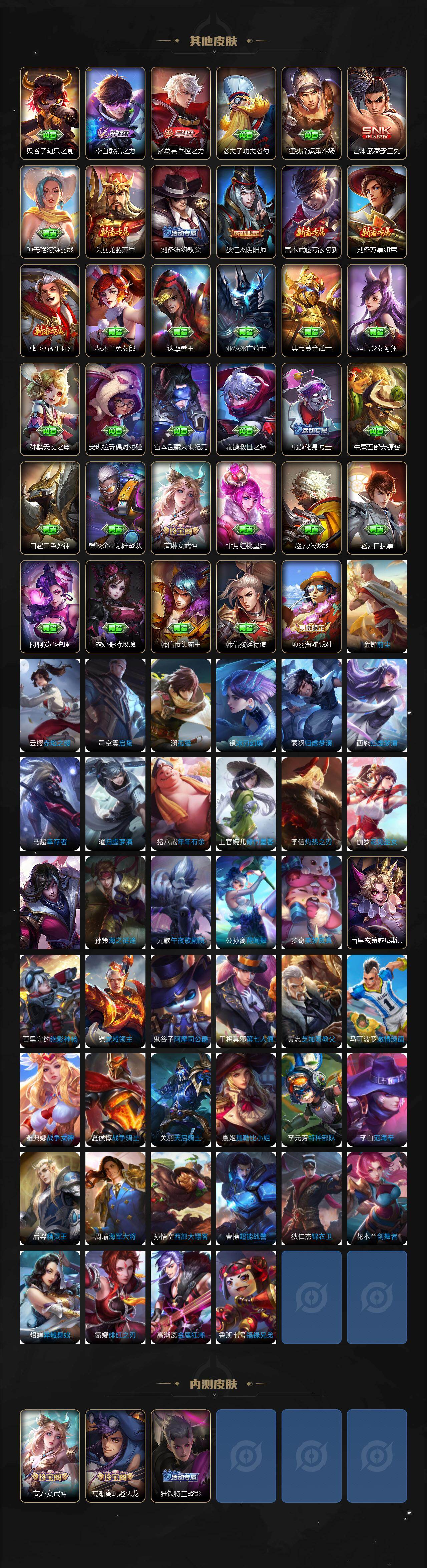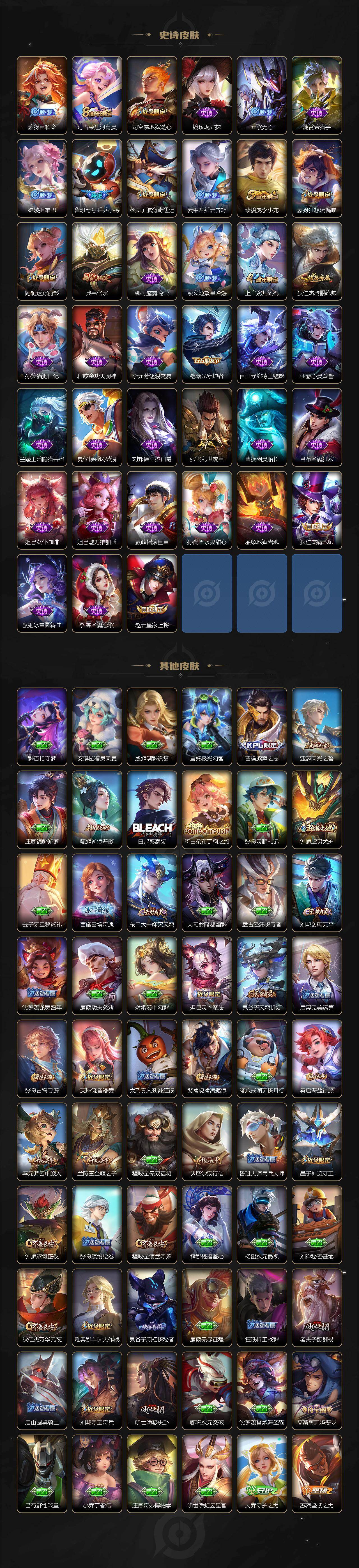 【史诗皮肤】:周瑜线条小狗,少司缘巫礼祀神,后羿石田雨龙,狂铁龙之律动,高渐离燃音魔法,妲己灵卜魔法,蒙犽百解令,阿古朵江河有灵,司空震地狱燃心,镜玫瑰异探,元歌无心,澜赏金猎手,嫦娥拒霜思,鲁班七号乒乒小将,老夫子航海奇遇记,云中君纤云弄巧,裴擒虎李小龙,蒙犽狂想玩偶喵,阿轲迷踪丽影,典韦岱宗,娜可露露晚萤,蔡文姬繁星吟游,上官婉儿梁祝,狄仁杰鹰眼统帅,孙策猫狗日记,程咬金功夫厨神,李元芳逐浪之夏,铠曙光守护者,百里守约特工魅影,亚瑟心灵战警,兰陵王暗隐猎兽者,夏侯惇乘风破浪,刘邦德古拉伯爵,张飞乱世虎臣,曹操幽灵船长,吕布圣诞狂欢,妲己女仆咖啡,妲己魅力维加斯,嬴政摇滚巨星,孙尚香水果甜心,廉颇地狱岩魂,狄仁杰魔术师,甄姬冰雪圆舞曲,貂蝉圣诞恋歌,赵云皇家上将