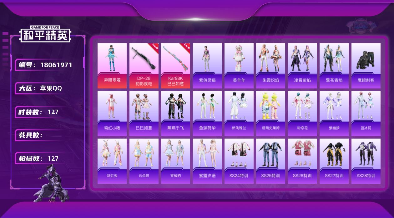 [18061971]苹果 手Q-1粉装-4特效枪-0载具-1粉色飞行器-35555热力值-11王牌印记-127套装-127枪皮 【热门品类】:套装-粉红小猪 【粉色套装】:角色-异瞳寒姬 【粉色枪皮等级】:ACE32-萌骑漫游(五级),Kar98K-巳巳如意(五级),Mk14-福马献瑞(五级),DP-28-豹影疾电(五级) 【粉色枪皮】:ACE32-萌骑漫游,Kar98K-巳巳如意,Mk14-福马献瑞,DP-28-豹影疾电 【粉色飞行器】:圣域金龙飞行器 【粉色降落伞】:莲影清波降落伞,雪月幻音降落伞,圣域龙灵降落伞,炫彩糖果降落伞 【稀有套装】:套装-巳巳如意,套装-雪国风尚,套装-马上有钱,套装-迅捷龙虾,套装-燕燕于飞,套装-鱼渊荷华,套装-新风雅兰,套装-萌萌史莱姆,套装-粉恋花,套装-紫幽梦,套装-蓝冰羽,套装-彩虹兔,套装-云朵鹅,套装-雪绒豹,套装-蜜露汐语,套装-朱霞炽焰,套装-凌霄紫焰,套装-擎苍青焰,玩偶服-美羊羊,角色-紫俏灵猫 【稀有枪皮】:AKM-影袭,AKM-破晓战魂,AKM-龙的传人,M16A4-红色方程式,SCAR-L-夜灯,SCAR-L-红色方程式,M416-糯团青竹,GROZA-影袭,GROZA-治愈之星,AUG-天降萌叽,AUG-甜蜜菠萝,QBZ-彩虹符号,M762-云朵鹅,G36C-桃粉嫣然,蜜獾-天降萌叽,蜜獾-绯穹魔姬,Famas-桃粉嫣然,ARX-凌霄紫焰,UZI-啾咪啾咪,UZI-影袭,UMP45-夜灯,UMP45-生命誓言,汤姆逊-天降萌叽,汤姆逊-幻影战神,汤姆逊-炫彩节奏,汤姆逊-智耀战神,JS9-凌霄紫焰,P90-巳巳如意,M24-影袭,SKS-圣域龙灵,VSS-彩虹符号,M417-惊鸿侠骨,M200-惊鸿侠骨,M200-六号稻草人,SVD-云朵鹅,S686-巳巳如意,S12K-玩趣呆呆,S12K-夜灯,AA12-G-炫光之旅,SPAS-12-云朵鹅,M249-彩虹符号,MG3-惊鸿侠骨,MG-36-凌霄紫焰,P92-凌霄紫焰,短管霰弹-圣域龙灵,沙漠之鹰-云朵鹅,爆炸猎弓-惊鸿侠骨,大砍刀-云朵鹅,平底锅-凌霄紫焰,破片手榴弹-巳巳如意 【其他套装】:套装-SS24特训,套装-SS25特训,套装-SS26特训,套装-SS27特训,套装-SS28特训,套装-SS29特训,套装-人气偶像,套装-光之冒险,套装-军械专家,套装-冷焰