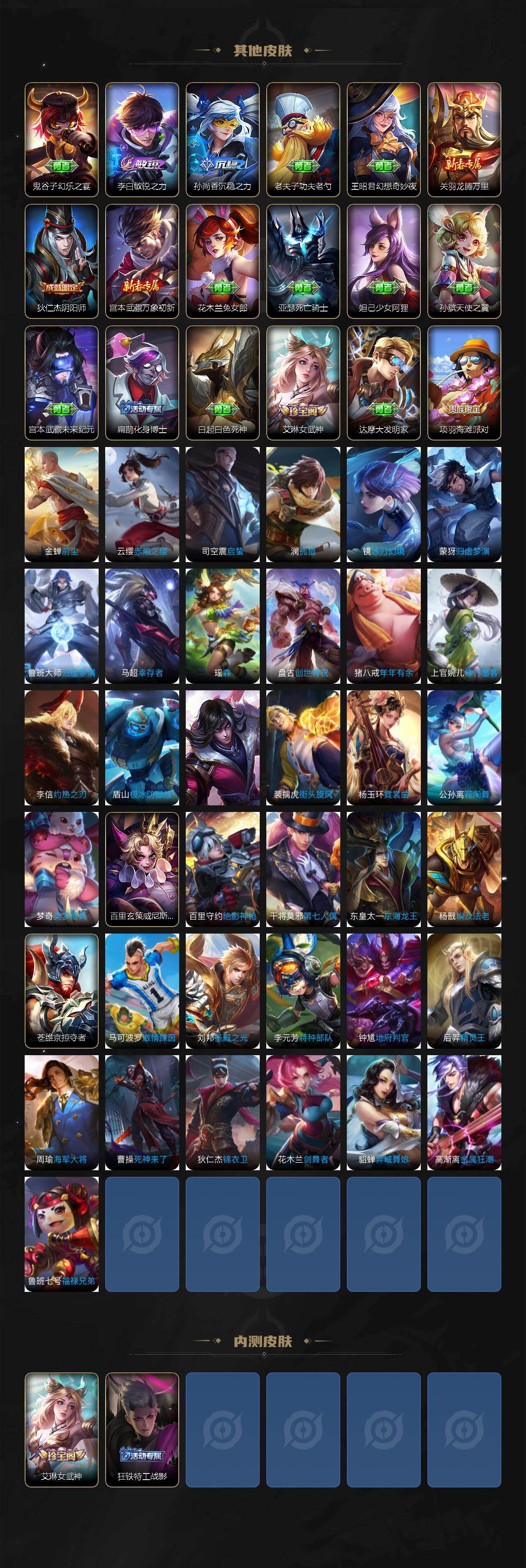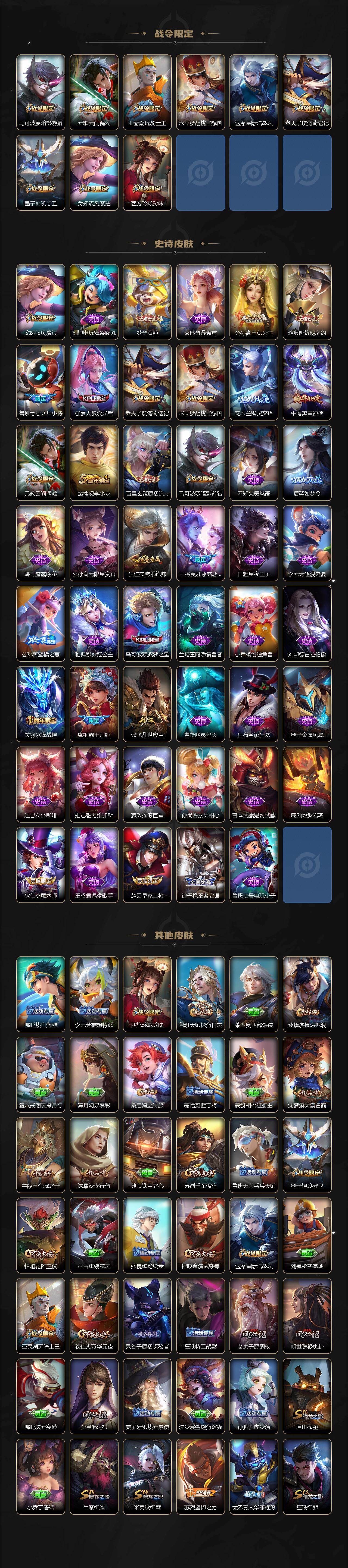 【限定皮肤】:狄仁杰阴阳师,赵云皇家上将,墨子神迹守卫,鲁班七号乒乒小将,鲁班七号寅虎瑞焰,钟无艳王者之锤,元歌云间偶戏,马可波罗逐梦之星,马可波罗暗影游猎,马可波罗深海之息,狄仁杰魔术师,狄仁杰万华元夜,达摩星际陆战队,达摩沙漠行僧,项羽海滩派对,老夫子醍醐杖,老夫子航海奇遇记,关羽冰锋战神,程咬金演武夺筹,兰陵王金庭之子,花木兰默契交锋,亚瑟潮玩骑士王,牛魔御旌,牛魔奔雷神使,后羿如梦令,虞姬霸王别姬,钟馗驱傩正仪,干将莫邪冰霜恋舞曲,雅典娜黎明之约,太乙真人华丽摇滚,鬼谷子原初探秘者,诸葛亮时雨天司,苏烈千军破阵,百里玄策原初追逐者,弈星混沌棋,梦奇顽趣,公孙离蜜橘之夏,公孙离祈雪灵祝,公孙离玉兔公主,沈梦溪大漠名商,明世隐疑决卦,裴擒虎李小龙,裴擒虎擒涛扼浪,狂铁御狮,米莱狄御霄,米莱狄胡桃异想国,伽罗太华,伽罗天狼溯光者,盾山御銮,西施玲珑珍味,鲁班大师探海日志,桑启海盐诗旅,戈娅驭风魔法,艾琳女武神