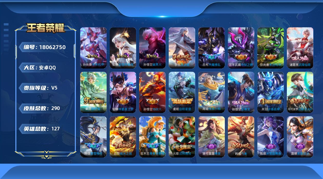 [18062750]【特价出售/店主推荐】:安卓Q-V5-最强王者段位-127英雄-290皮肤-3星元-9传说-81史诗