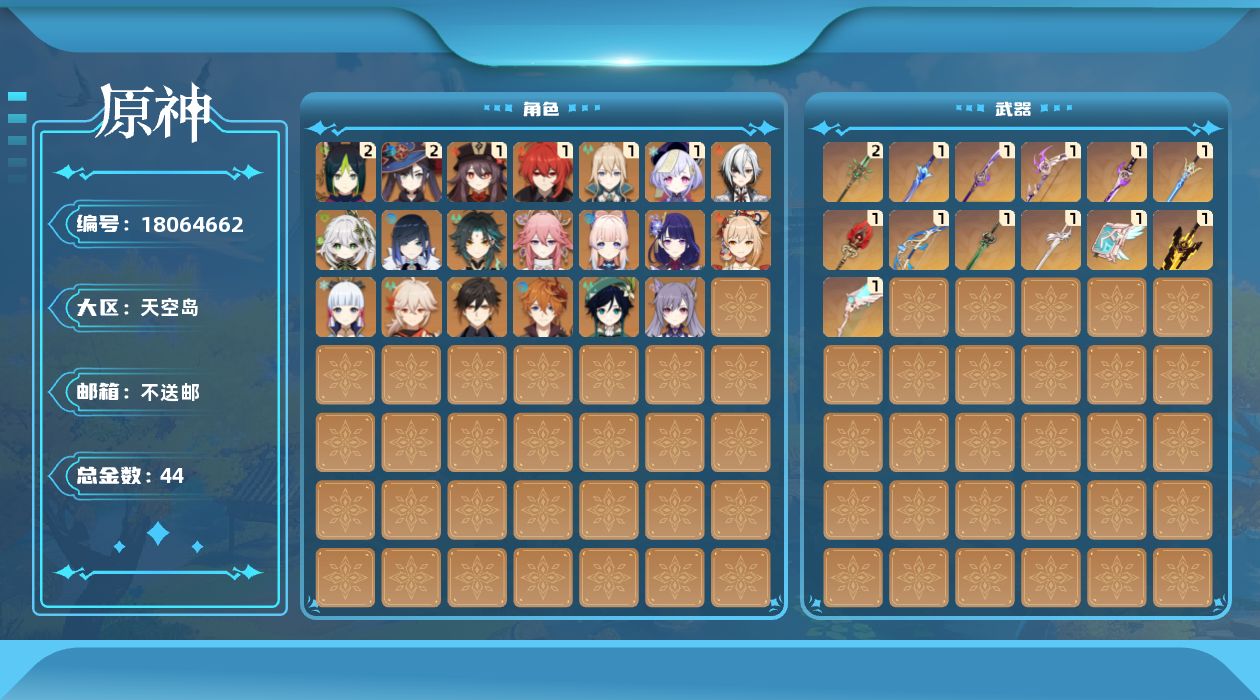 0命阿蕾奇诺,0命纳西妲,2命提纳里,0命夜兰,0命八重神子,0命雷电将军,0命枫原万叶,0命神里绫华,0命钟离,1命胡桃,0命魈,0命宵宫,0命温迪,0命达达利亚,0命珊瑚宫心海,0命刻晴,1命七七,1命琴,2命莫娜,1命迪卢克,精1波乱月白经津,精1终末嗟叹之诗,精1薙草之稻光,精1飞雷之弦振,精1雾切之回光,精1苍古自由之誓,精1无工之剑,精1护摩之杖,精1磐岩结绿,精2和璞鸢,精1天空之翼,精1天空之卷,精1风鹰剑