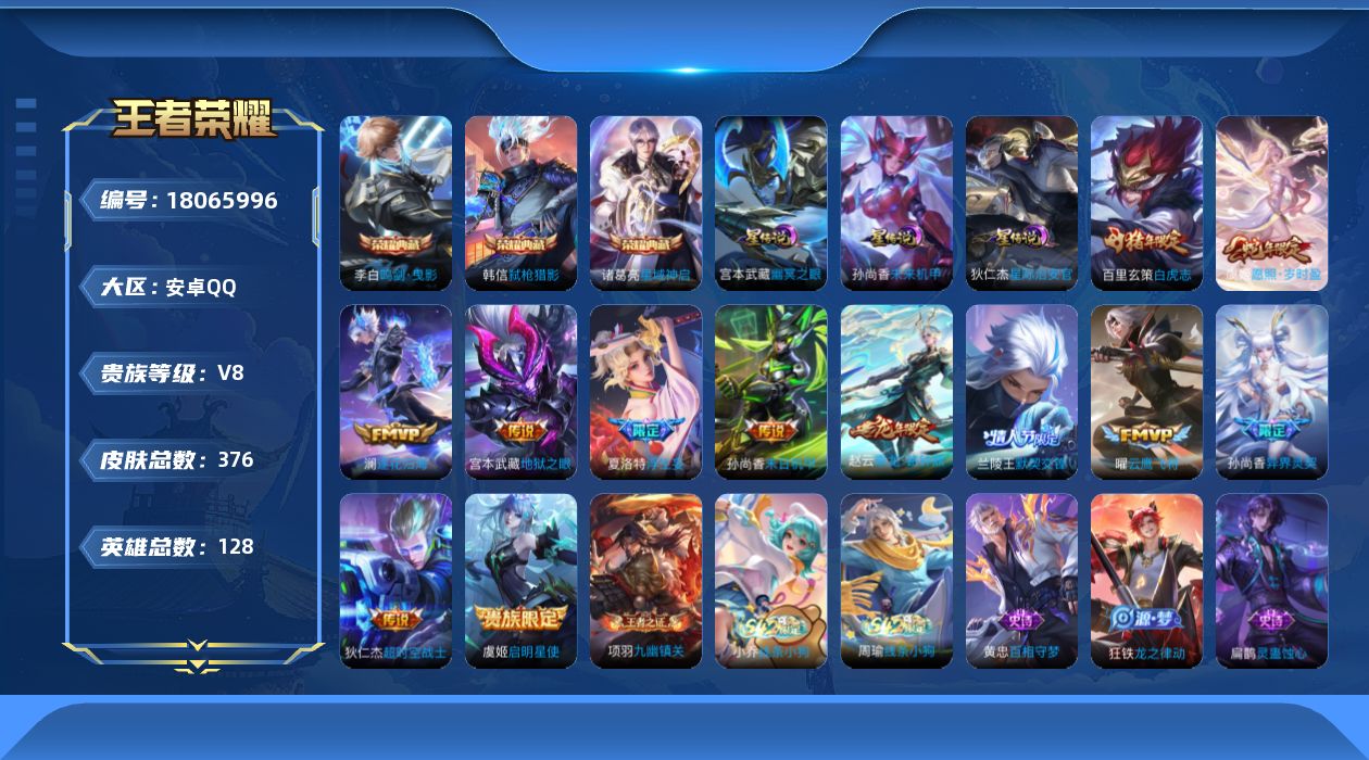 - [12871061]安卓Q-V8-至尊星耀V段位-126英雄-264皮肤-2典藏-0珍品无双-0无双-1珍品传说-26传说-73史诗 【英雄全皮】:孙权全皮,苍全皮,大司命全皮,空空儿全皮,影全皮,少司缘全皮 【荣耀典藏】:铠银白咏叹调,韩信弑枪猎影 【珍品传说】:瑶大耳狗之梦 【传说皮肤】:元歌诡秘之主,大司命死亡执政官,司马懿九山相柳,公孙离云诺千山,司空震愿照山河定,妲己愿照众生和,澜愿照九州拓,虞姬愿照岁时盈,云缨幻光神枪,桑启鸣野蒿,庄周牧神诗旅,朵莉亚心动手记,典韦战鼓燎原,吕布遇见神鼓,马可波罗妄想实况,花木兰燃星之曲,李白诗剑行,孙策挚爱之约,镜炽阳神光,虞姬启明星使,曜云鹰飞将,刘备时之恋人,张良黄金白羊座,干将莫邪久胜战神,宫本武藏地狱之眼,狄仁杰超时空战士 【限定皮肤】:蒙犽顽岩魄,蔡文姬夏日便利店,大乔绒语心约,虞姬夏日便利店,姜子牙天穹之誓,狄仁杰阴阳师,赵云皇家上将,赵云百木心枪,高渐离玩趣恶龙,阿轲迷踪丽影,吕布遇见神鼓,马可波罗妄想实况,狄仁杰魔术师,项羽海滩派对,安琪拉魔法小厨娘,花木兰燃星之曲,虞姬启明星使,铠青龙志,孙策挚爱之约,上官婉儿神器万象笔,西施玲珑珍味,西施至美乘鲤谣,鬼谷子天穹祈灯,沈梦溪龙舞盛年,鲁班七号蔬乡物语,李元芳蔬乡物语,刘邦剑破天穹,程咬金群星魔术团,镜青焰无极,项羽苍威无极,朵莉亚心动手记,刘备异域游侠,芈月浮光幕影,周瑜熔金海岸 【年限皮肤】:铠青龙志 【赛季限定】:鬼谷子天穹祈灯,刘邦剑破天穹,姜子牙天穹之誓 【战令限定】:蔡文姬夏日便利店,虞姬夏日便利店,阿轲迷踪丽影,西施玲珑珍味,鲁班七号蔬乡物语,李元芳蔬乡物语,镜青焰无极,项羽苍威无极 【史诗皮肤】:露娜紫霞仙子,赵云皇家上将,赵云未来纪元,甄姬冰雪圆舞曲,王昭君偶像歌手,狄仁杰魔术师,宫本武藏鬼剑武藏,孙尚香水果甜心,嬴政摇滚巨星,妲己魅力维加斯,妲己女仆咖啡,墨子龙骑士,墨子金属风暴,吕布圣诞狂欢,吕布末日机甲,安琪拉魔法小厨娘,张飞乱世虎臣,花木兰水晶猎龙者,刘邦德古拉伯爵,夏侯惇乘风破浪,兰陵王暗隐猎兽者,诸葛亮黄金分割率,亚瑟心灵战警,雅典娜冰冠公主,安琪拉心灵骇客,百里守约特工魅影,蔡文姬舞动绿茵,李元芳逐浪之夏,阿轲节奏热浪,孙策猫狗日记,铠青龙志,伽罗箭羽风息,狄仁杰鹰眼统帅,公孙离无限星赏官,小乔青蛇,阿轲迷踪丽影,橘右京修罗,瑶遇见神鹿,孙