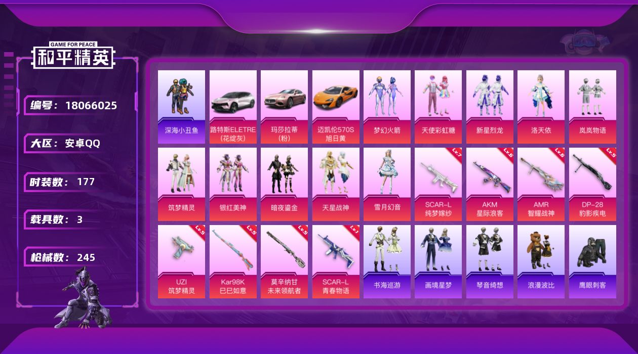 [18066025]安卓 手Q-10粉装-10特效枪-3载具-4粉色飞行器-91890热力值-12王牌印记-177套装-245枪皮 【热门品类】:粉装-梦幻火箭,套装-浪漫天命,套装-深海小丑鱼,套装-小丑鱼,角色-军刀雅典娜,套装-AG战队服,套装-龟仙人,套装-暗影哥特,套装-浪漫波比,套装-粉红小猪 【粉色套装】:粉装-天使彩虹糖,粉装-梦幻火箭,粉装-新星烈龙,角色-洛天依,粉装-岚岚物语,粉装-筑梦精灵,粉装-银红美神,粉装-暗夜鎏金,粉装-天星战神,粉装-雪月幻音 【粉色枪皮等级】:AKM-星际浪客(六级),SCAR-L-青春物语(一级),SCAR-L-纯梦嫁纱(七级),ACE32-萌骑漫游(三级),UZI-筑梦精灵(五级),Kar98K-巳巳如意(五级),Mk14-福马献瑞(二级),莫辛纳甘-未来领航者(五级),AMR-智耀战神(六级),DP-28-豹影疾电(五级) 【粉色载具】:路特斯ELETRE(花绽灰),玛莎拉蒂Ghibli(粉),迈凯伦570S(旭日黄),僚机-萌兔起飞 【粉色枪皮】:AKM-星际浪客,SCAR-L-青春物语,SCAR-L-纯梦嫁纱,ACE32-萌骑漫游,UZI-筑梦精灵,Kar98K-巳巳如意,Mk14-福马献瑞,莫辛纳甘-未来领航者,AMR-智耀战神,DP-28-豹影疾电 【粉色飞行器】:梦幻火箭飞行器,青春物语飞行器,星际浪客飞行器,梦幻舞会飞行器 【粉色降落伞】:百万伏特降落伞,至尊龙雀降落伞,梦幻火箭降落伞,星之彼岸降落伞,洛神天依降落伞,环太平洋降落伞,旋转彩虹降落伞,暗夜鎏金降落伞,圣堂之誓降落伞,千金淑猫降落伞,临安公主降落伞,月影灵韵降落伞,樱桃泡泡降落伞,圣域龙灵降落伞,智耀战神降落伞,冷漠罗丽降落伞,虹云熊熊降落伞 【稀有套装】:套装-龟仙人,套装-巳巳如意,套装-雪国风尚,套装-顽皮橙,套装-马上有钱,套装-暮夜私语,套装-糖糖葫芦,套装-青团波波,套装-棉花软糖,角色-摩登魅猫,套装-闪电轻猫,套装-粉恋花,套装-紫幽梦,套装-蓝冰羽,套装-星渊小夜曲,套装-书海巡游,套装-画境星梦,套装-琴音绮想,套装-雨过天青,套装-红釉青花 【稀有枪皮】:AKM-彩虹符号,AKM-灼热熔岩,AKM-缤纷海域,AKM-虎虎生威,AKM-霓虹街区,AKM-龙的传人,M16A4-幻世战舞者,M16A4-甜心亚梦,M16A4-红色方程式,