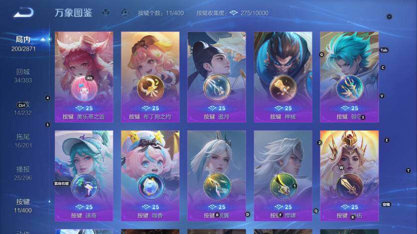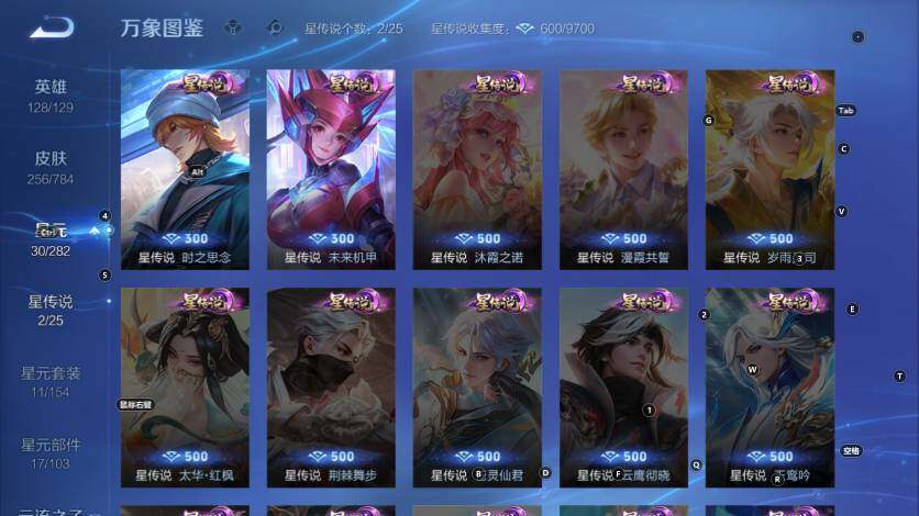 李元芳逐浪之夏,不知火舞魅语,公孙离无限星赏官,大乔猫狗日记,孙策猫狗日记,阿轲节奏热浪,露娜紫霞仙子,诸葛亮黄金分割率,项羽苍穹之光,雅典娜冰冠公主,吕布末日机甲,橘右京修罗,墨子龙骑士,刘禅绅士熊喵,刘禅天才门将,白起星夜王子,安琪拉心灵骇客,刘邦德古拉伯爵,兰陵王暗隐猎兽者,曹操幽灵船长,宫本武藏鬼剑武藏,司马懿暗渊魔法,亚瑟心灵战警,杨戬天秀·启明,蔡文姬舞动绿茵,廉颇地狱岩魂,小乔缤纷独角兽,夏侯惇乘风破浪,花木兰水晶猎龙者,铠曙光守护者,墨子金属风暴,百里玄策原初追逐者,吕布圣诞狂欢,貂蝉圣诞恋歌,百里守约特工魅影,嫦娥拒霜思,雅典娜黎明之约,李白千年之狐,夏洛特永昼,澜赏金猎手,弈星滕王阁序,刘禅电玩·爆裂旋风,蒙犽百解令,上官婉儿群星魔术团,李白谪仙醉月,赵怀真器灵·浮梦炉