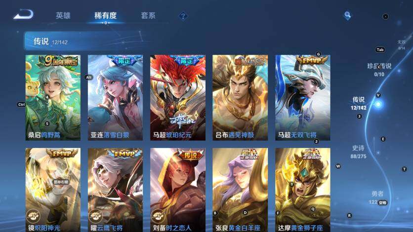 【传说皮肤】:桑启鸣野蒿,亚连落雪白狼,马超琥珀纪元,吕布遇见神鼓,马超无双飞将,镜炽阳神光,曜云鹰飞将,刘备时之恋人,张良黄金白羊座,达摩黄金狮子座,宫本武藏地狱之眼,吕布天魔缭乱