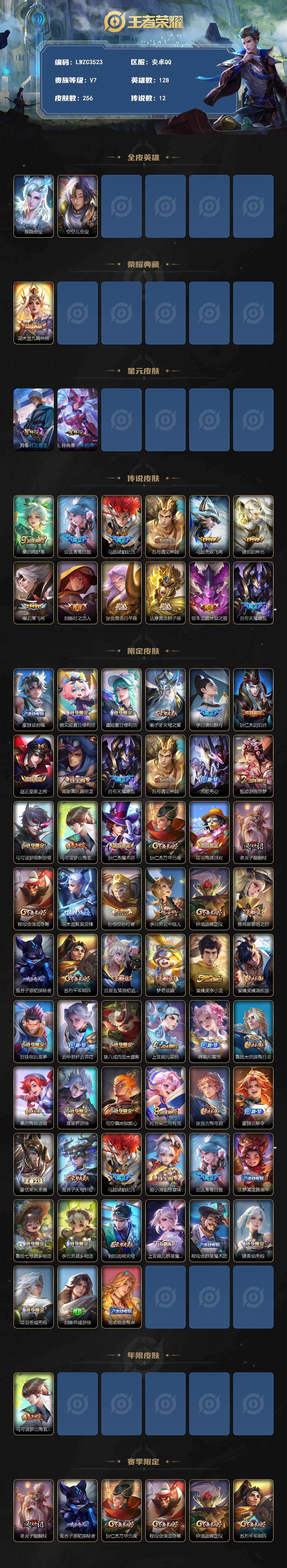 - [16362903]安卓Q-V10-最强王者段位-128英雄-656皮肤-17典藏皮肤-1典藏英雄-8无双-9星元-110传说-233史诗 【英雄全皮】:赵云全皮,墨子全皮,孙尚香全皮,阿轲全皮,扁鹊全皮,夏侯惇全皮,达摩全皮,项羽全皮,武则天全皮,关羽全皮,程咬金全皮,露娜全皮,姜子牙全皮,刘邦全皮,韩信全皮,孙权全皮,花木兰全皮,张良全皮,不知火舞全皮,娜可露露全皮,橘右京全皮,刘备全皮,李元芳全皮,钟馗全皮,哪吒全皮,太乙真人全皮,大乔全皮,百里玄策全皮,梦奇全皮,云中君全皮,李信全皮,盾山全皮,猪八戒全皮,上官婉儿全皮,海月全皮,蒙犽全皮,鲁班大师全皮,镜全皮,阿古朵全皮,夏洛特全皮,金蝉全皮,戈娅全皮,海诺全皮,少司缘全皮 【荣耀典藏】:武则天英雄,孙悟空全息碎影,武则天倪克斯神谕,夏侯惇无限飓风号,小乔天鹅之梦,孙尚香杀手不太冷,鲁班七号星空梦想,芈月大秦宣太后,程咬金活力突击,李白鸣剑曳影,诸葛亮星域神启,花木兰九霄神辉,关羽赤影疾锋,铠银白咏叹调,貂蝉幻阙歌,韩信弑枪猎影,虞姬神鉴启示录,吕布千魇归渊 【无双皮肤】:武则天神器明辉仪,妲己青丘九尾,瑶真我赫兹,李白碎月剑心,小乔时之魔女,韩信群星魔术团,不知火舞花合斗,公孙离离恨烟 【传说皮肤】:后羿神树通天,桑启鸣野蒿,夏侯惇霜北刀,铠冥王哈迪斯,朵莉亚心动手记,云中君群星魔术团,墨子黄金天蝎座,海月金乌负日,亚连落雪白狼,吕布曦玄引,貂蝉曦玄引,典韦战鼓燎原,孙尚香乘龙问璇玑,孙策乘龙淬吴钩,赵云乘龙铭钟鼎,马超琥珀纪元,铠琥珀纪元,澜逐花归海,艾琳觅芳踪,露娜霜月吟,孙膑小动物乐团,狄仁杰夜礼服假面,王昭君永恒水手月亮,甄姬至美化雀舞,大乔时之奇旅,鲁班七号时之奇旅,兰陵王影龙天霄,吕布遇见神鼓,宫本武藏惊梅引,云缨鹤归松栖,上官婉儿妄想奇谈,马可波罗妄想实况,东皇太一灼幽烈阳,诸葛亮鹤羽星尊,澜电玩雷克斯,亚瑟追逃游戏,安琪拉追逃游戏,张飞百相守梦,公孙离记忆之芯,夏洛特浮生妄,干将莫邪画中仙,花木兰燃星之曲,虞姬无限倾心,项羽无限倾心,伽罗炽翼辉光,孙悟空齐天大圣,小乔山海琳琅生,曜山海苍雷引,李信山海炽霜斩,吕布怒海麟威,李白诗剑行,狄仁杰神器狴犴令,不知火舞绯月行,王昭君星穹之声,百里守约碎云,橘右京枫霜尽,娜可露露前尘镜,孙尚香音你闪耀,马可波罗深海之息,后羿无尽星芒,马超无双飞将,大乔挚爱花嫁,孙策挚