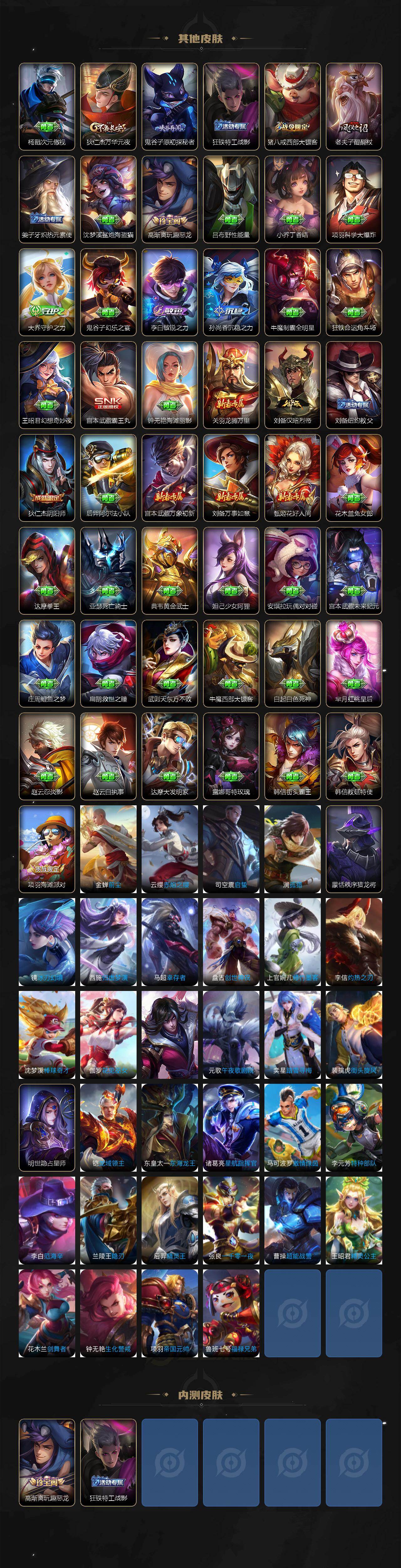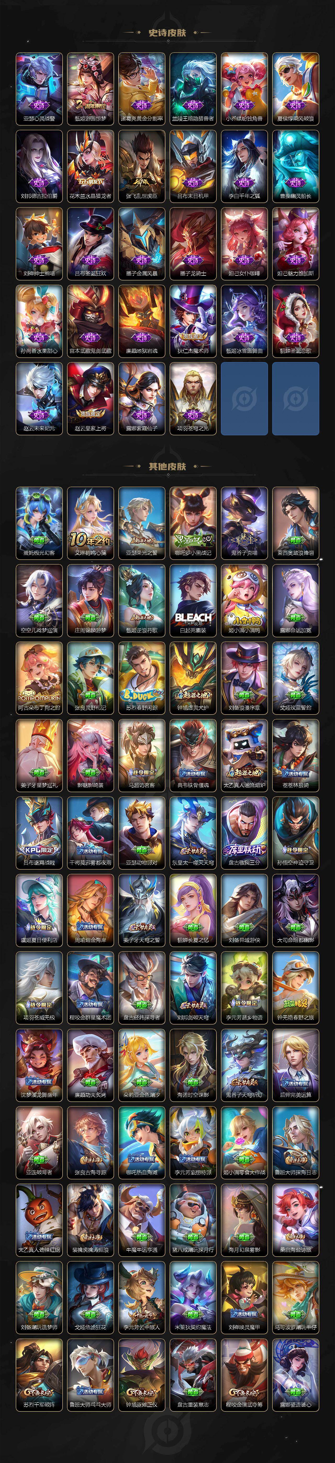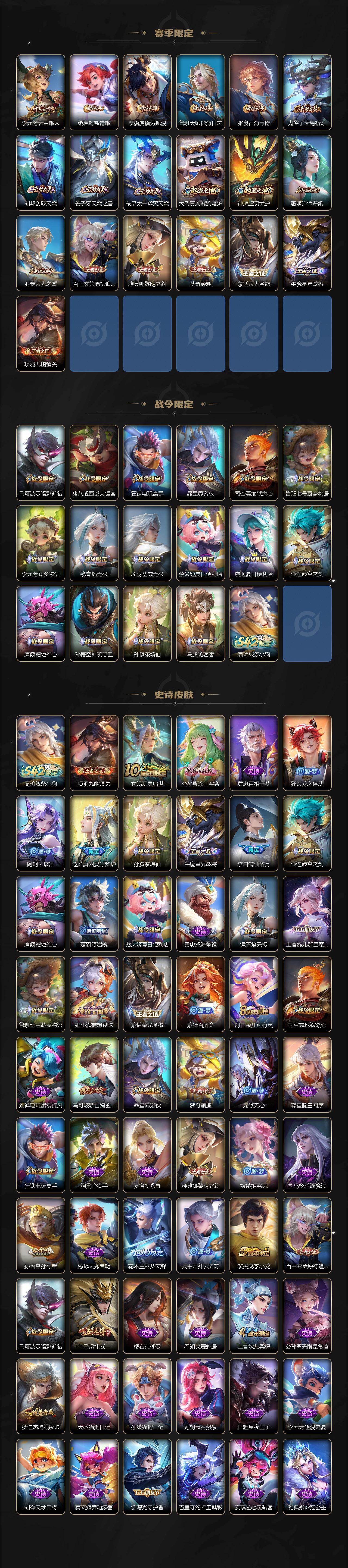 【限定皮肤】:蒙犽顽岩魄,蔡文姬夏日便利店,虞姬夏日便利店,姜子牙天穹之誓,李白谪仙醉月,狄仁杰阴阳师,赵云皇家上将,高渐离玩趣恶龙,吕布天魔缭乱,吕布遇见神鼓,元歌无心,甄姬游园惊梦,马可波罗暗影游猎,马可波罗山海玄木吟,狄仁杰魔术师,狄仁杰万华元夜,项羽海滩派对,老夫子醍醐杖,程咬金演武夺筹,花木兰默契交锋,孙悟空孙行者,李元芳云中旅人,钟馗驱傩正仪,雅典娜黎明之约,鬼谷子原初探秘者,苏烈千军破阵,百里玄策原初追逐者,梦奇顽趣,裴擒虎李小龙,裴擒虎擒涛扼浪,狂铁电玩高手,云中君纤云弄巧,猪八戒西部大镖客,上官婉儿梁祝,嫦娥拒霜思,鲁班大师探海日志,桑启海盐诗旅,暃星界游侠,司空震地狱燃心,阿古朵江河有灵,张良古海寻踪,蒙犽百解令,蒙恬荣光圣徽,鬼谷子天穹祈灯,马超琥珀纪元,姬小满妄想食味,亚连落雪白狼,沈梦溪龙舞盛年,鲁班七号蔬乡物语,李元芳蔬乡物语,刘邦剑破天穹,上官婉儿群星魔术团,程咬金群星魔术团,镜青焰无极,项羽苍威无极,刘备异域游侠,周瑜熔金海岸