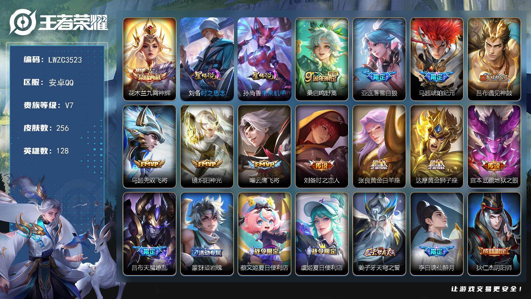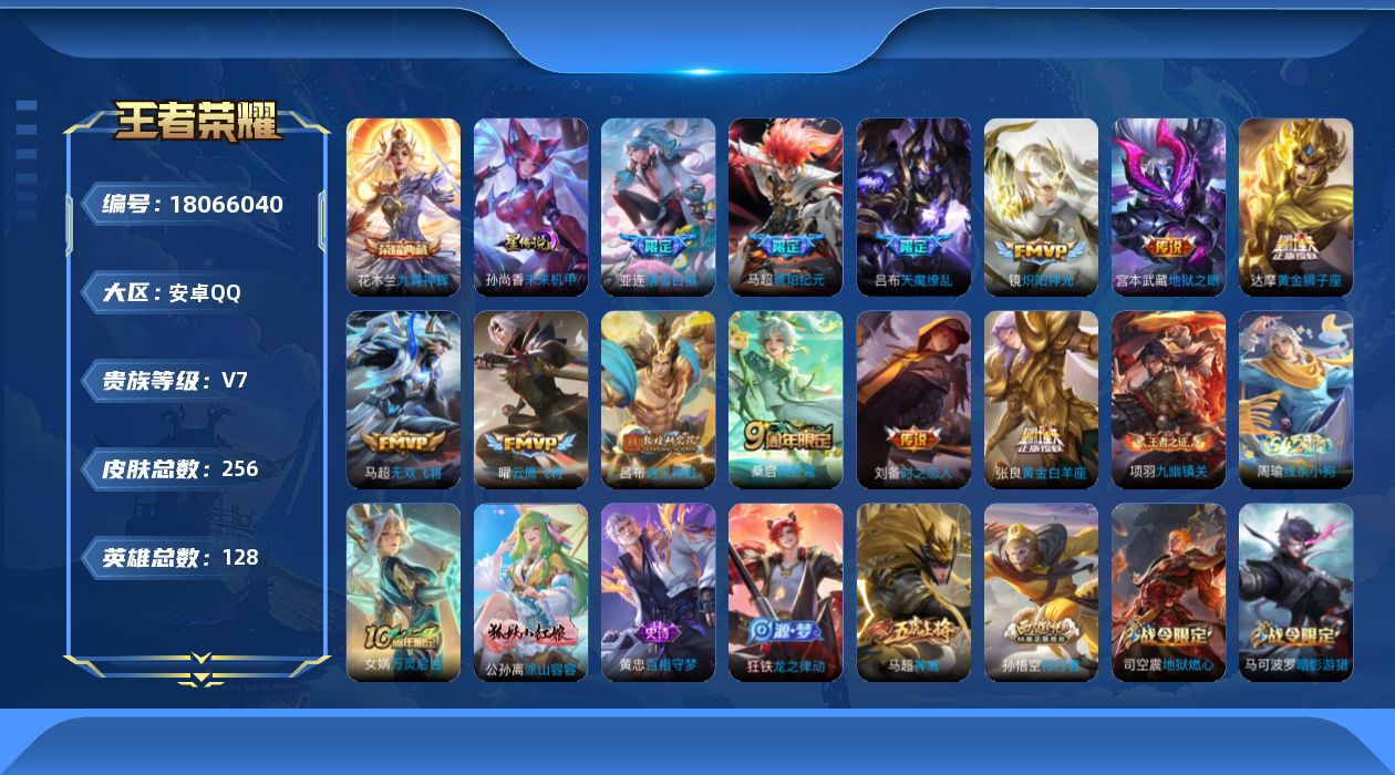 [18066040]可二次【特价出售/店主推荐/精品边野号】万战金标吕布、万战金标花木兰、万战金标马超、万战金标亚连、对抗段55段,安卓Q-V7-最强王者段位-128英雄-256皮肤-1典藏皮肤-2星传说-12传说-87史诗