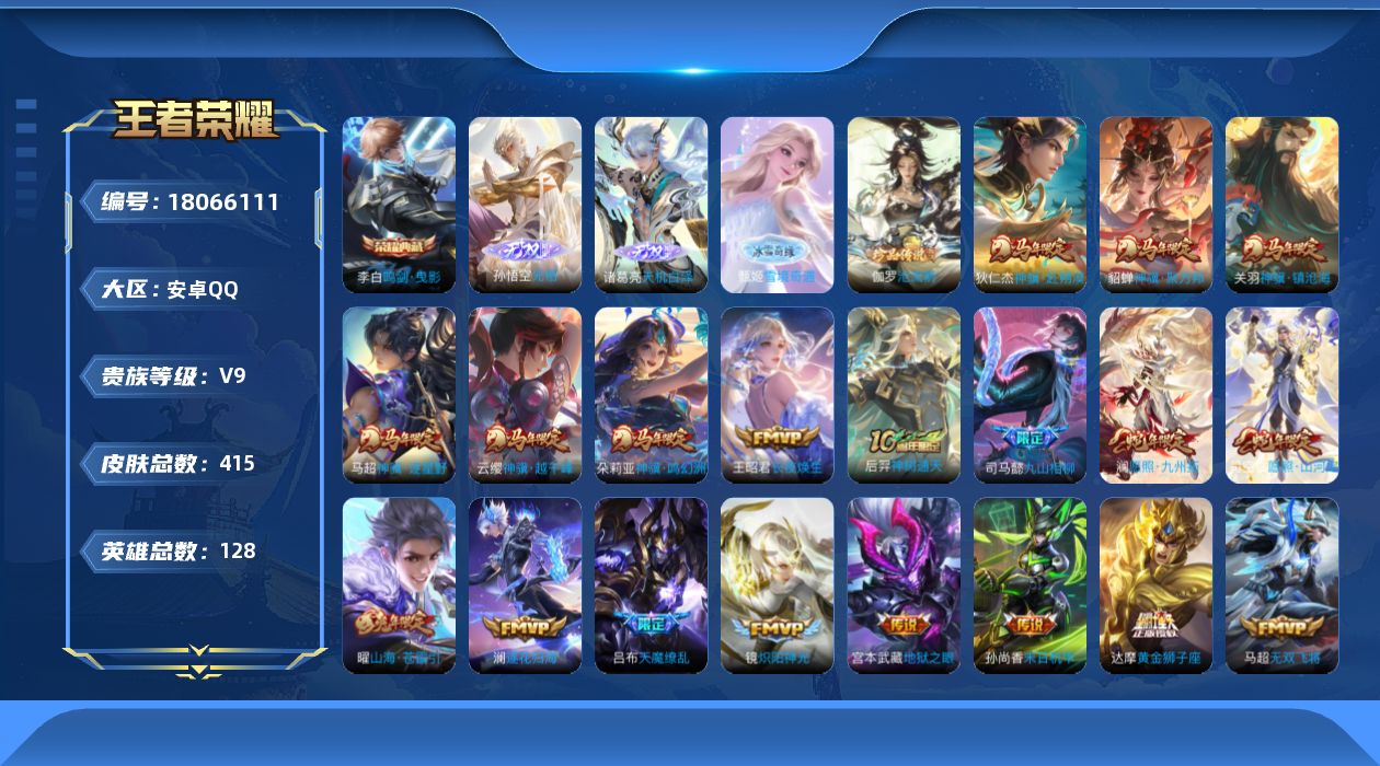 [18066111]安卓Q-V9-最强王者段位-128英雄-415皮肤-1典藏皮肤-3无双-1珍品传说-36传说-123史诗