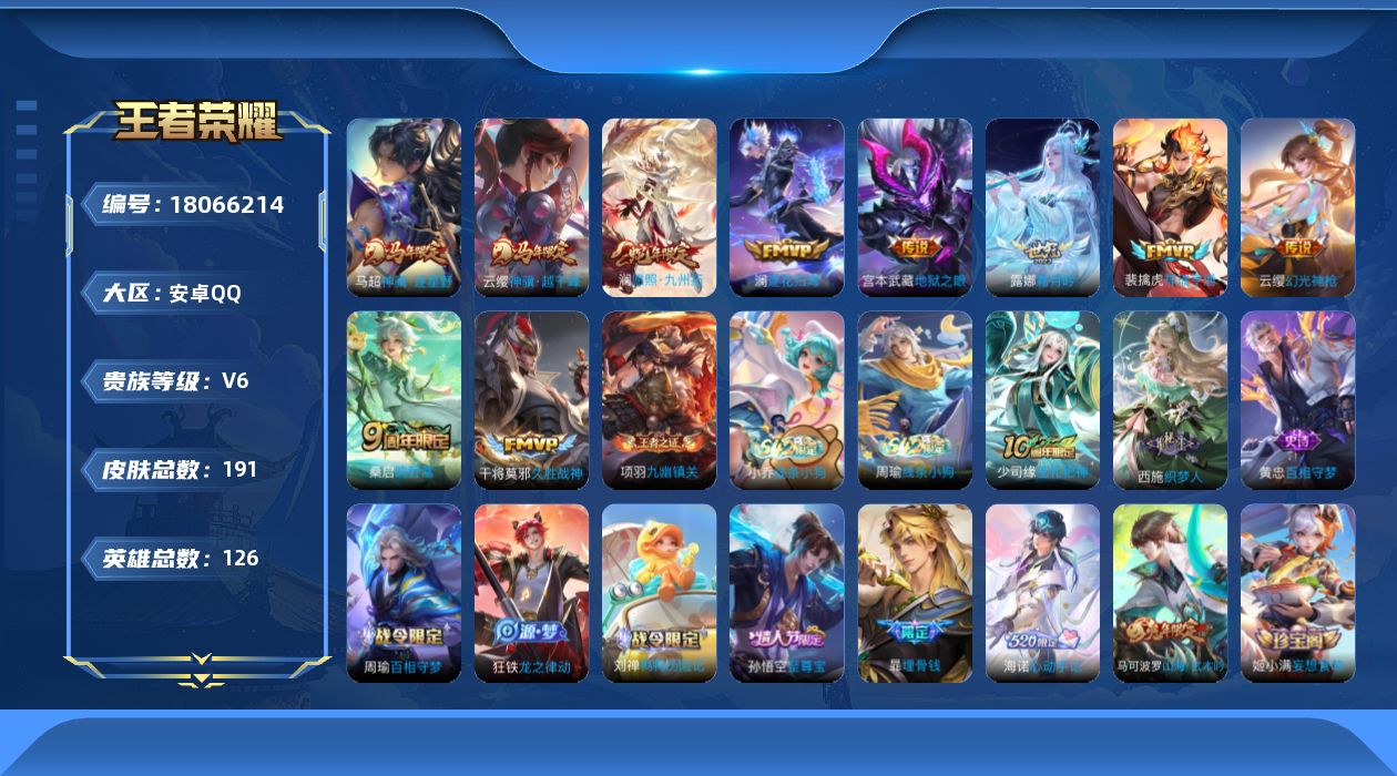 [18066214]安卓Q-V6-最强王者段位-126英雄-191皮肤-10传说-49史诗
