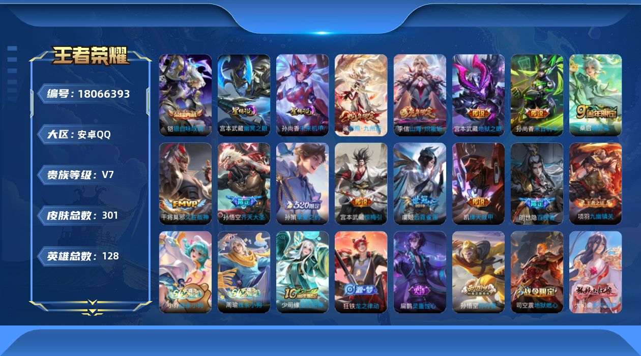 [18066393]可二次【特价出售/店主推荐/9市标/36段打野/6437星币】:安卓Q-V7-最强王者段位-128英雄-301皮肤-1典藏皮肤-2星元-11传说-77史诗