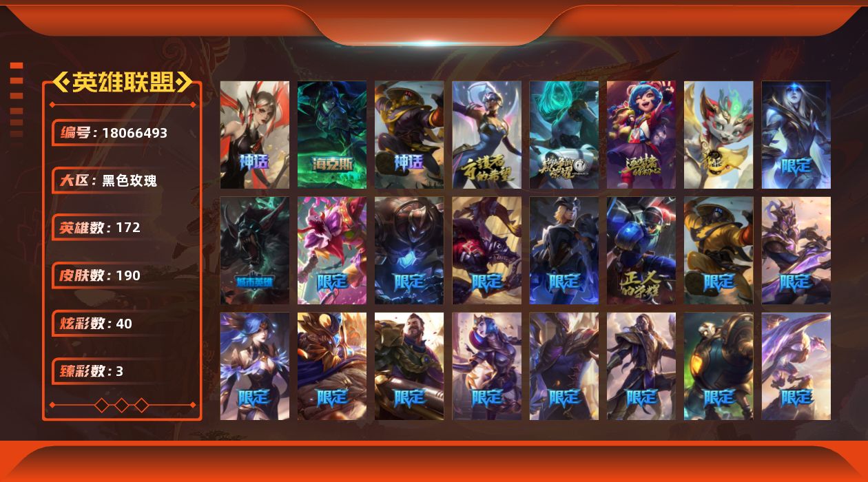 [18066493]未定级段位-172英雄-190皮肤-40炫彩-0终极-7神话-27限定-19传说-56史诗