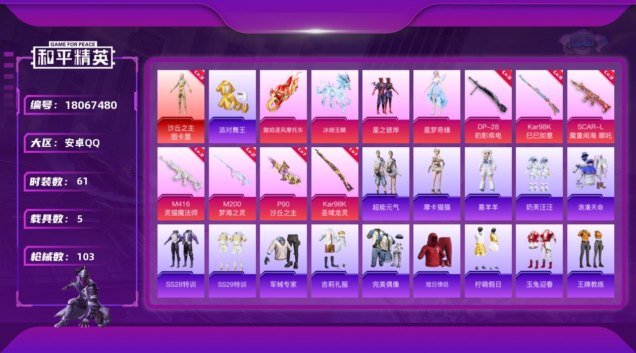 - [16606040]【店主推荐捡漏号!可直接换绑】苹果 手Q-6粉装-4特效枪-2载具-3粉色飞行器-47413热力值-3王牌印记-106套装-141枪皮【热门品类】:粉装-梦幻火箭,套装-小丑鱼,套装-龟仙人,角色-Mark.06【粉色套装】:粉装-梦幻火箭,角色-洛天依,粉装-寒光使者,角色-小可学妹,粉装-未来歌姬,粉装-炫光之旅【粉色枪皮等级】:Kar98K-巳巳如意(五级),M24-莲影清波(七级),DP-28-千金淑猫(七级),DP-28-豹影疾电(五级)【粉色载具】:兰博基尼Estoque(银翼灰),布加迪威龙(海洋蓝)【粉色枪皮】:Kar98K-巳巳如意,M24-莲影清波,DP-28-千金淑猫,DP-28-豹影疾电【粉色飞行器】:天之羽翼飞行器,圣光天使飞行器,深渊漩涡飞行器