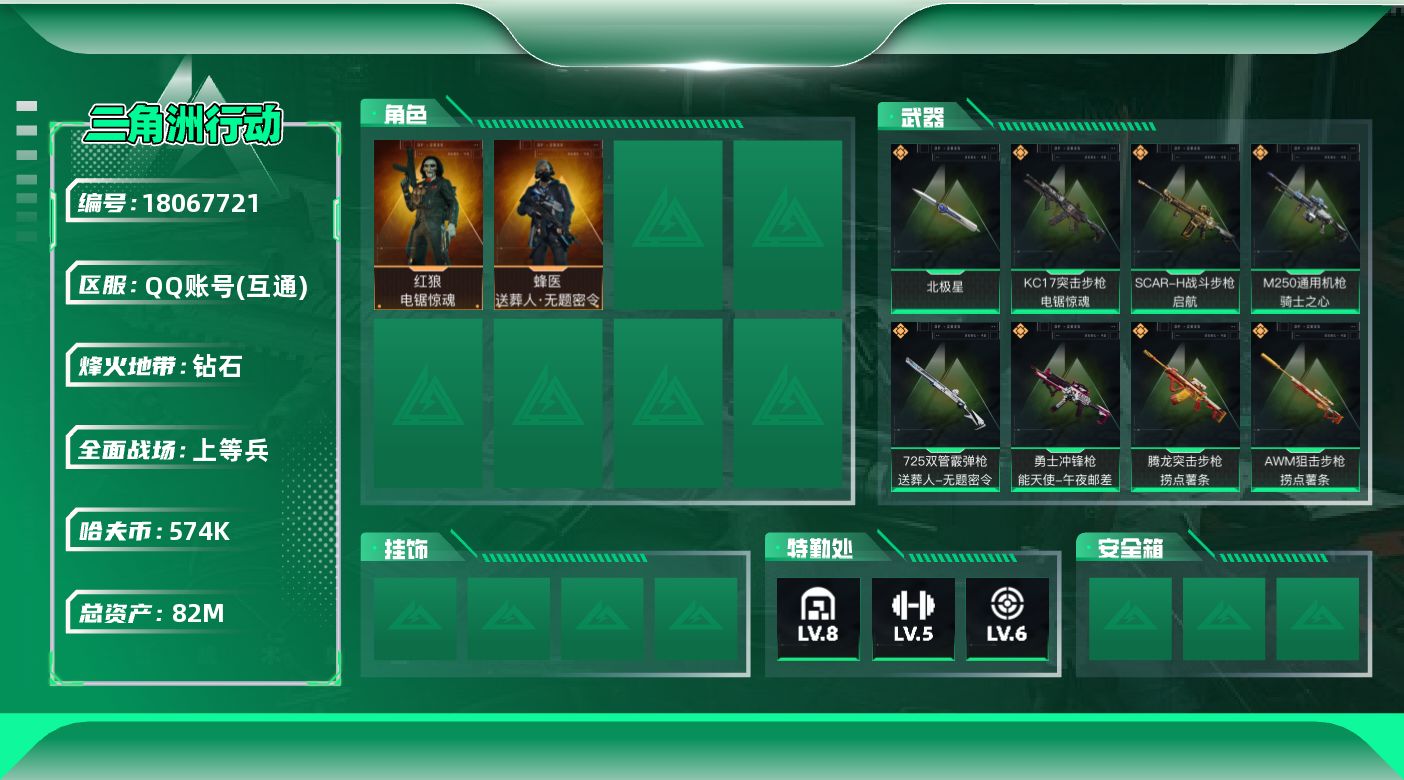 [18067721]【店主推荐捡漏号!可直接换绑】574k哈伏币-54m流动资产-60烽火等级-钻石-14战场等级-上等兵 【干员外观】:蜂医-送葬人·无题密令,红狼-电锯惊魂 【近战皮肤】:近战-北极星,近战-黑鹰 【传说外观】:M4A1突击步枪-阿米娅,AK-12突击步枪-特斯拉线圈,SCAR-H战斗步枪-启航,CAR-15突击步枪-阿米娅,腾龙突击步枪-捞点薯条,K437突击步枪-北极星,KC17突击步枪-电锯惊魂,UZI冲锋枪-特斯拉线圈,SR-3M紧凑突击步枪-特斯拉线圈,勇士冲锋枪-能天使-午夜邮差,QCQ171冲锋枪-北极星,725双管霰弹枪-送葬人-无题密令,M250通用机枪-骑士之心,AWM狙击步枪-捞点薯条,93R-捞点薯条,复合弓-黑·天际线 【史诗外观】:ASh-12战斗步枪-无极限,M16A4突击步枪-竞赛选手,SCAR-H战斗步枪-囚徒,AS Val突击步枪-典狱官,腾龙突击步枪-无垢,K437突击步枪-守护者,MP5冲锋枪-深海恐惧,MP5冲锋枪-战术竞备,MP5冲锋枪-竞技风,Vector冲锋枪-阿萨拉文明,SR-3M紧凑突击步枪-荒野求生,SR-3M紧凑突击步枪-战术竞备,勇士冲锋枪-工业狂潮,MP7冲锋枪-无垢,MP7冲锋枪-守护者,S12K霰弹枪-曙光,PKM通用机枪-荒野求生,M250通用机枪-囚徒,Mini-14射手步枪-守护者,SVD狙击步枪-阿萨拉工艺,SVD狙击步枪-荒野求生,PSG-1射手步枪-无垢,SV-98狙击步枪-林中猎手,SV-98狙击步枪-囚徒,SV-98狙击步枪-猎鳄行动,M700狙击步枪-竞技风,M700狙击步枪-蝮蛇,M700狙击步枪-哈夫克警备,AWM狙击步枪-无极限,复合弓-守护者 【稀有外观】:AKM突击步枪-战术演练,AKM突击步枪-肃杀,QBZ95-1突击步枪-公平竞技,K416突击步枪-虎啸,M7战斗步枪-前沿科技,M7战斗步枪-捣蛋鬼,SCAR-H战斗步枪-荣耀列队,SCAR-H战斗步枪-黄昏,G3战斗步枪-战术演练,G3战斗步枪-主宰,腾龙突击步枪-雪崩,腾龙突击步枪-前沿科技,腾龙突击步枪-冰天雪地,K437突击步枪-天狼星,MP5冲锋枪-弄臣,MP5冲锋枪-虎啸,MP5冲锋枪-哈夫克卫队,P90冲锋枪-黄昏,Vector冲锋枪-先锋,UZI冲锋枪-亚特兰蒂斯,SMG-45-行动开启,SMG-45冲