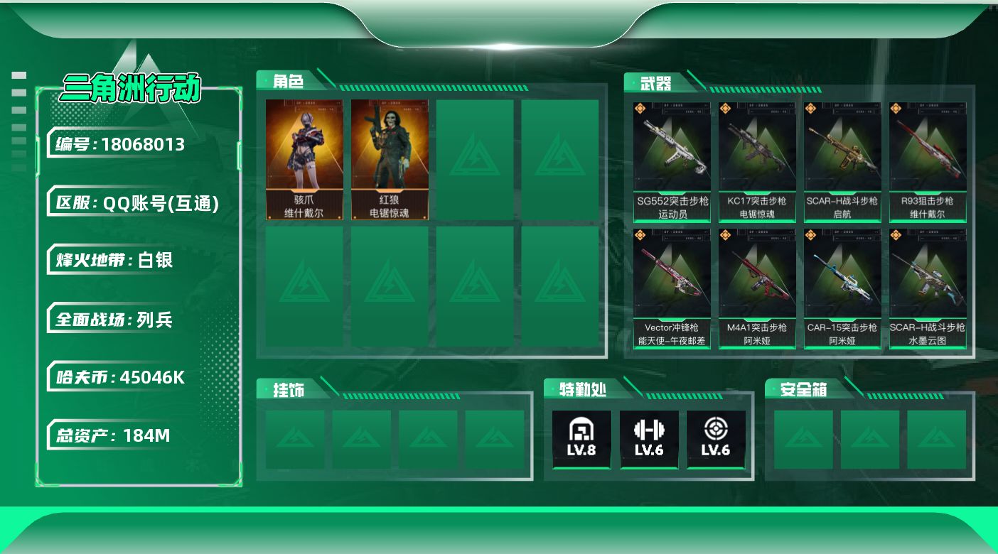 [18068013]【店主推荐捡漏号!可直接换绑】 45046k哈伏币-155m流动资产-58烽火等级-白银-9战场等级-列兵 【干员外观】:骇爪-维什戴尔,红狼-电锯惊魂 【近战皮肤】:近战-黑鹰 【传说外观】:M4A1突击步枪-阿米娅,SG552突击步枪-运动员,SCAR-H战斗步枪-水墨云图,SCAR-H战斗步枪-启航,CAR-15突击步枪-阿米娅,KC17突击步枪-电锯惊魂,Vector冲锋枪-能天使-午夜邮差,R93狙击步枪-维什戴尔 【史诗外观】:AUG突击步枪-蝮蛇,SCAR-H战斗步枪-囚徒,AS Val突击步枪-百步穿杨,腾龙突击步枪-猎鳄行动,MP5冲锋枪-战术竞备,Vector冲锋枪-异域战争,S12K霰弹枪-曙光,SV-98狙击步枪-猎鳄行动 【稀有外观】:MP7冲锋枪-黑潮,M7战斗步枪-捣蛋鬼,SCAR-H战斗步枪-荣耀列队,腾龙突击步枪-冰天雪地,MP5冲锋枪-弄臣,MP5冲锋枪-哈夫克卫队,P90冲锋枪-黄昏,P90冲锋枪-捣蛋鬼,Vector冲锋枪-先锋,UZI冲锋枪-亚特兰蒂斯,SMG-45-行动开启,勇士冲锋枪-主宰,MP7冲锋枪-钢铁之躯,M1014霰弹枪-幻影结构,QJB201轻机枪-哈夫克卫队,Mini-14射手步枪-荣耀列队,SKS射手步枪-弄臣,SR-25射手步枪-开拓,G18-星链科技,G18-哈夫克航天 【普通外观】:M4A1突击步枪-粉色涂装,M4A1突击步枪-高雅黑,M4A1突击步枪-海色,QBZ95-1突击步枪-高雅黑,QBZ95-1突击步枪-海浪,QBZ95-1突击步枪-海色,K416突击步枪-几何迷彩,K416突击步枪-高雅黑,M16A4突击步枪-高雅黑,SG552突击步枪-浅蓝涂装,SCAR-H战斗步枪-数码迷彩,G3战斗步枪-高雅黑,CAR-15突击步枪-变色龙,MP5冲锋枪-海色,MP5冲锋枪-黄蜂,Vector冲锋枪-几何迷彩,UZI冲锋枪-海色,野牛冲锋枪-高雅黑,SR-3M紧凑突击步枪-变色龙,M1014霰弹枪-高雅黑,M1014霰弹枪-海浪,M249轻机枪-黄蜂,M250通用机枪-条纹,QJB201轻机枪-磐石,SVD狙击步枪-高雅黑,SR-25射手步枪-黄蜂,SV-98狙击步枪-红色涂装,QSZ92G-条纹,沙漠之鹰-海浪,沙漠之鹰-高雅黑 【载具外观】:轮式突击炮-荣耀 【军牌】:军牌-展示,军牌-享受