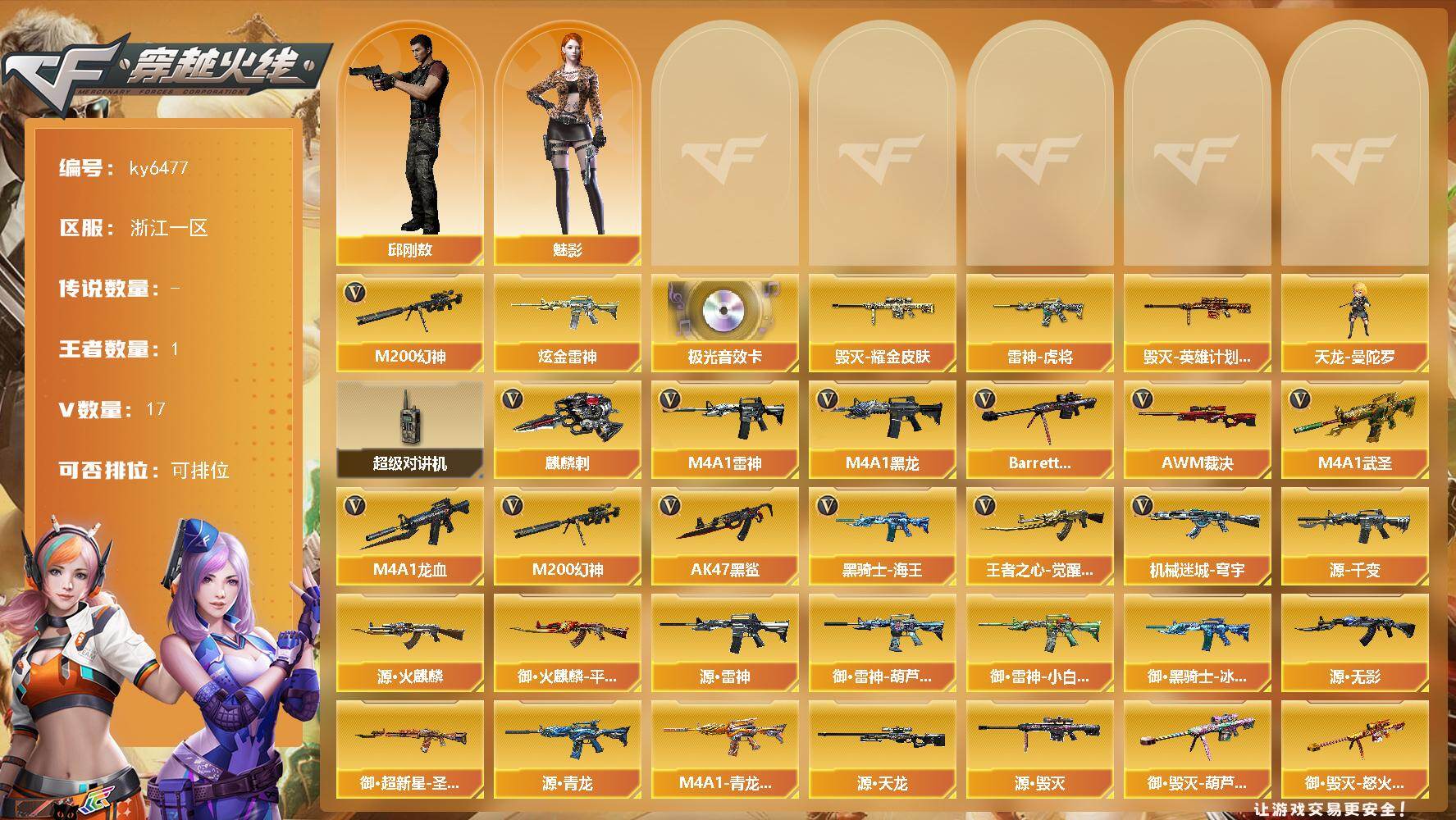 [18068393]【ky6477】浙江一区-19V-1王者武器数-1炫金武器数 【热门武器】:M200-幻神 【王者炫金武器】:炫金雷神 【音效卡】:Barrett-极光音效卡 【皮肤】:雷神-虎将,毁灭耀金皮肤,毁灭-英雄计划 皮肤 【角色】:魅影,邱刚敖 【人偶武器】:天龙-曼陀罗 【暴走生化】:超级对讲机 【英雄级武器】:M4A1-黑龙*2,M4A1-雷神*4,M4A1-武圣,AK47-黑鲨,M4A1-龙血,王者之心-觉醒版,黑骑士-海王,机械迷城-穹宇,Barrett-毁灭,AWM-裁决*2,M200-幻神,麒麟刺 【源级武器】:源-千变,源·火麒麟*2,御·火麒麟-平天大圣,源·雷神*2,御·雷神-葫芦兄弟,御·雷神-小白龙,御·黑骑士-冰魄,源·无影,御·超新星-圣诞,源·青龙,M4A1-青龙-掌上穿越火线,金色蔷薇-狼王,源·天龙,源·毁灭,御·毁灭-葫芦兄弟,御·毁灭-怒火大圣,魂·Barrett-朱雀-锦鲤,御·炼狱-女娲,源·天神,魂·屠龙-惊鸿,灵·麒麟刺-穹宇 【道具】:EDG炫彩背包,绿色巨人,灵魂忍者,迷雾幽灵,夺命之镰,防化服*3,防弹头盔*2,防弹衣*2,C4工具钳*2,手雷包*3 【特殊枪械】: