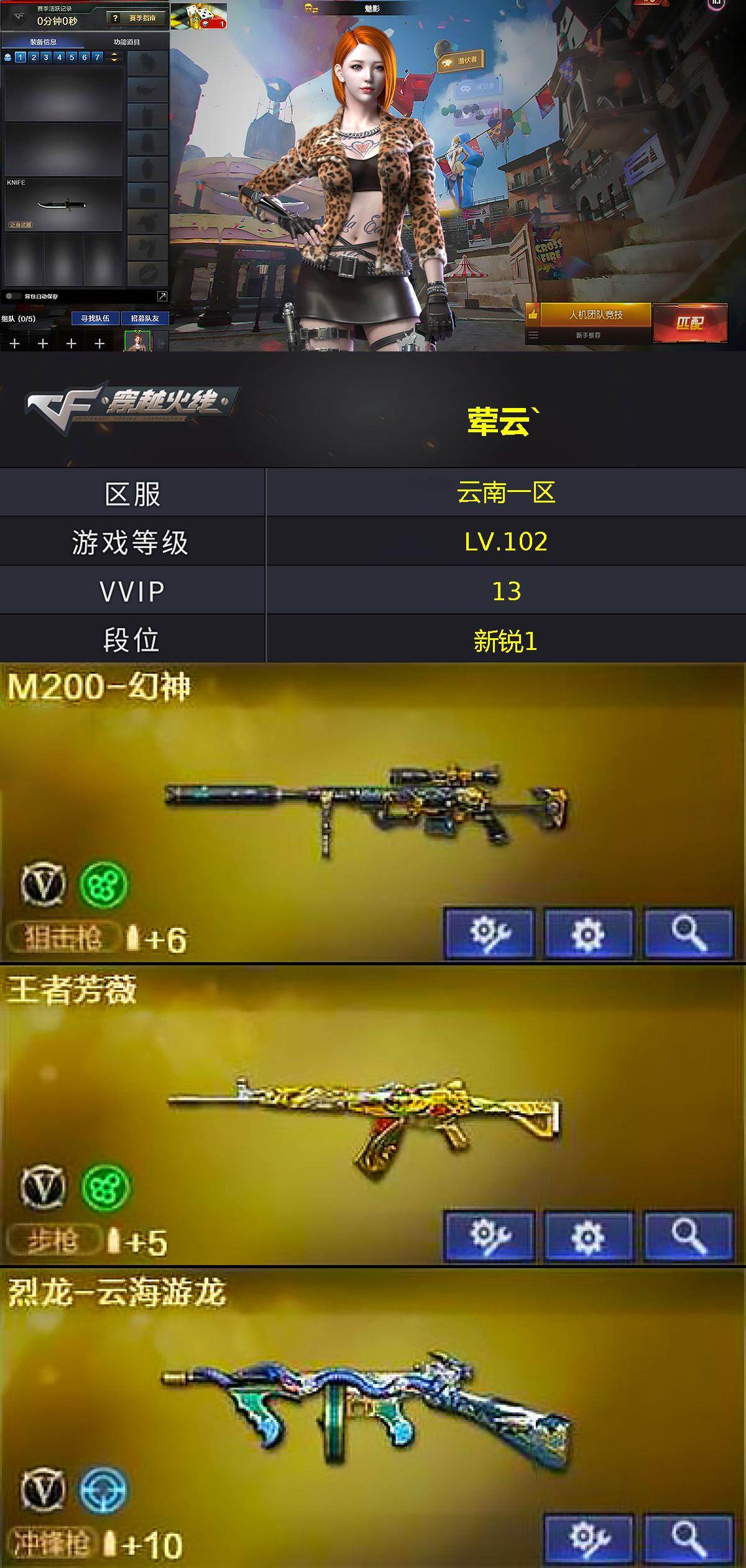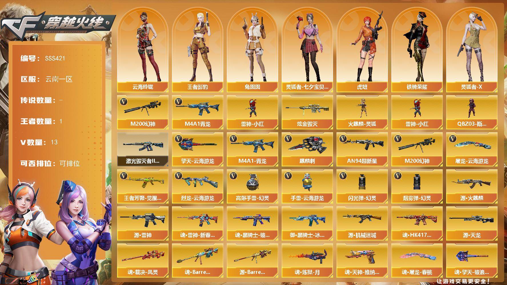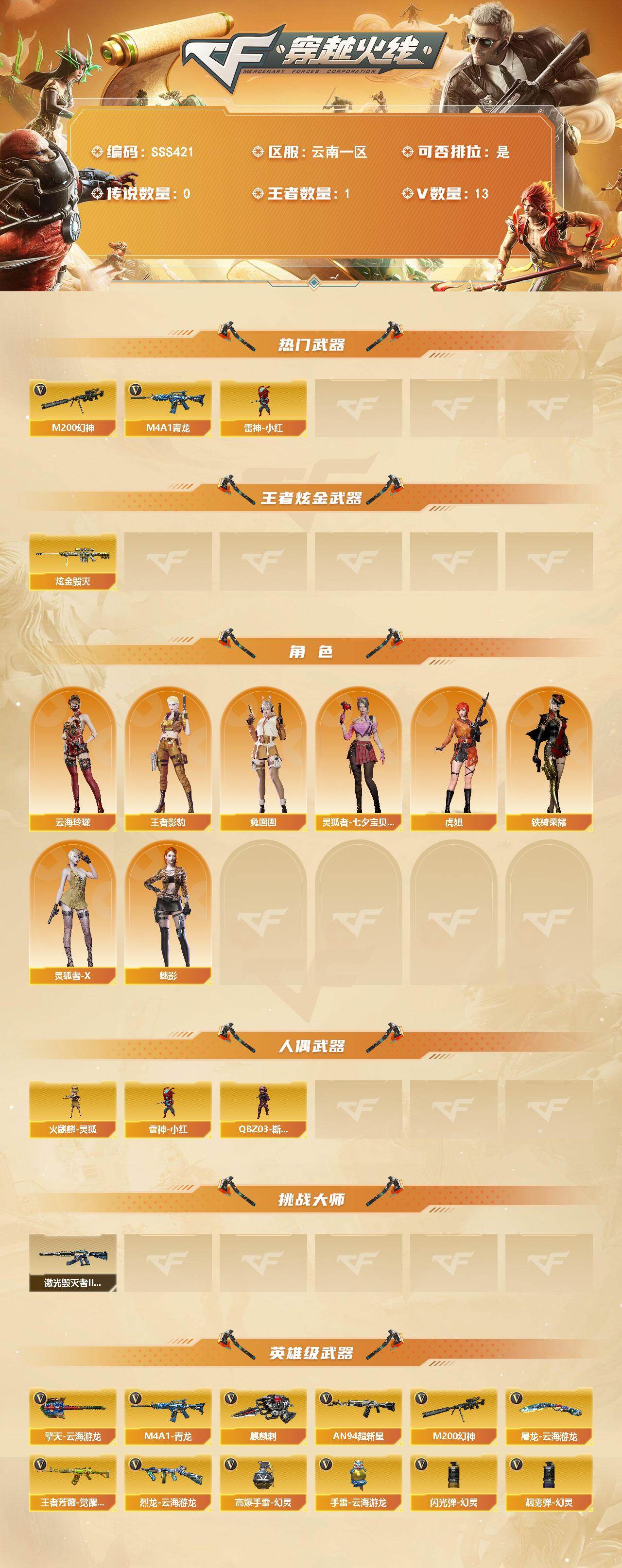 [18068487]云南一区-14V-1王者武器数-1炫金武器数 【热门武器】:M4A1-青龙,M200-幻神,雷神-小红 【王者炫金武器】:炫金毁灭 【角色】:魅影,王者影豹,云海玲珑,虎妞,灵狐者-X,灵狐者-七夕宝贝,铁骑荣耀,兔囡囡 【人偶武器】:雷神-小红,火麒麟-灵狐,QBZ03-斯沃特 【挑战大师】:激光毁灭者III-白马银枪 【英雄级武器】:AN94-超新星,M4A1-青龙,王者芳薇-觉醒版,M200-幻神,烈龙-云海游龙,麒麟刺,擎天-云海游龙,屠龙-云海游龙,高爆手雷-幻灵*2,手雷-云海游龙,闪光弹-幻灵,烟雾弹-幻灵 【其他武器】:源·火麒麟,源·雷神,魂·雷神-新春神龙,魂·黑骑士-破浪10年,御·黑骑士-冰魄,源·机械迷城*2,魂·HK417-朱雀-凤灵,源·天龙*2,魂·裁决-凤灵*2,魂·Barrett-朱雀- 新春神龙,源·Barrett-朱雀,魂·炼狱-月,魂·修罗-神兵利器,魂·天神-维纳斯,魂·屠龙-春桃,魂·擎天-破浪10年,魂·麒麟刺-月 【道具】:云海游龙炫彩背包,绿色巨人,灵魂忍者,迷雾幽灵,夺命之镰,防化服*2,金色流光-枪王排位,星辰流光-枪王排位,枪王排位28赛季金色流光,云海游龙表情,C4-红龙,防弹头盔*3,防弹衣*3,C4工具钳*3,手雷包*3 【特殊枪械】:
