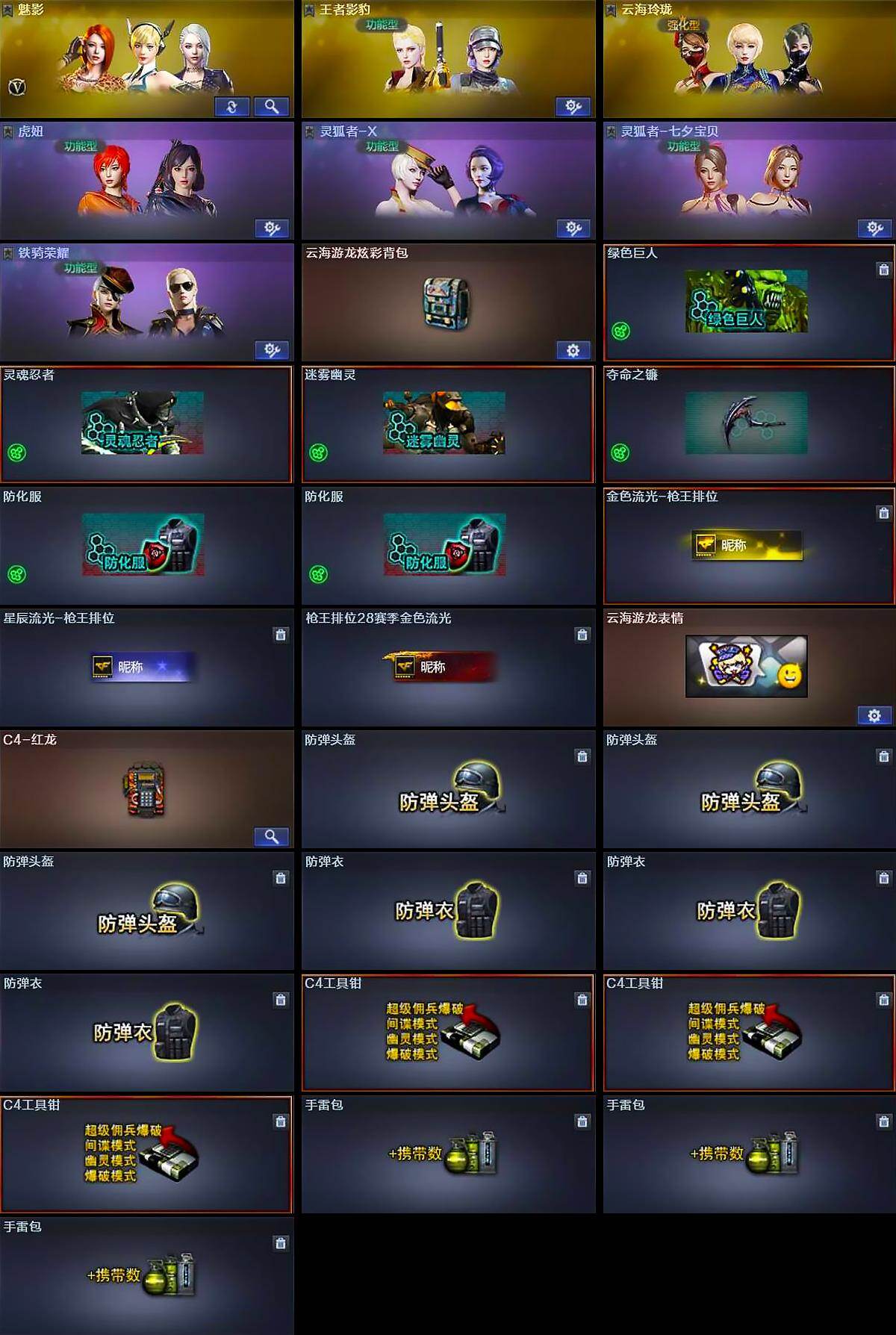 【道具】:云海游龙炫彩背包,绿色巨人,灵魂忍者,迷雾幽灵,夺命之镰,防化服*2,金色流光-枪王排位,星辰流光-枪王排位,枪王排位28赛季金色流光,云海游龙表情,C4-红龙,防弹头盔*3,防弹衣*3,C4工具钳*3,手雷包*3