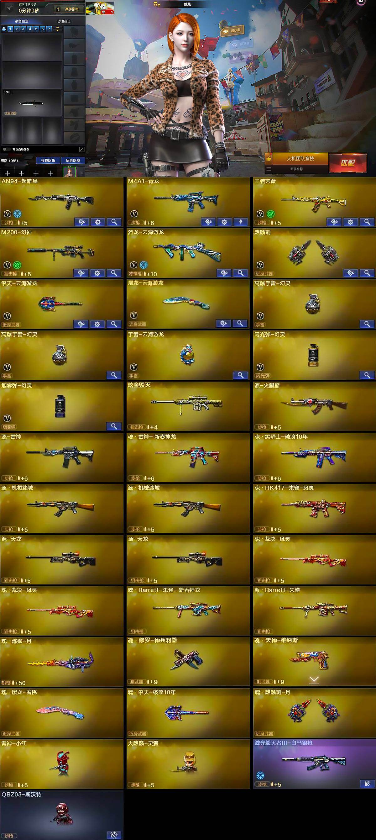 【英雄级武器】:AN94-超新星,M4A1-青龙,王者芳薇-觉醒版,M200-幻神,烈龙-云海游龙,麒麟刺,擎天-云海游龙,屠龙-云海游龙,高爆手雷-幻灵*2,手雷-云海游龙,闪光弹-幻灵,烟雾弹-幻灵