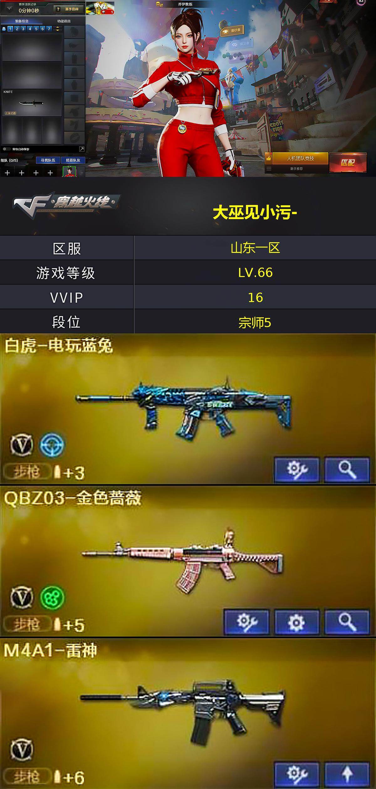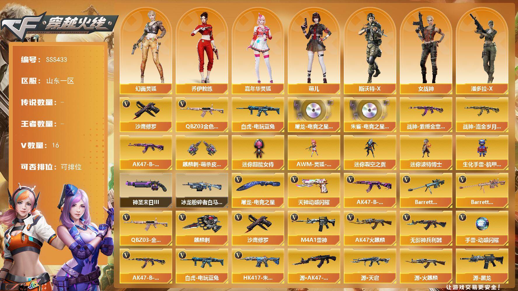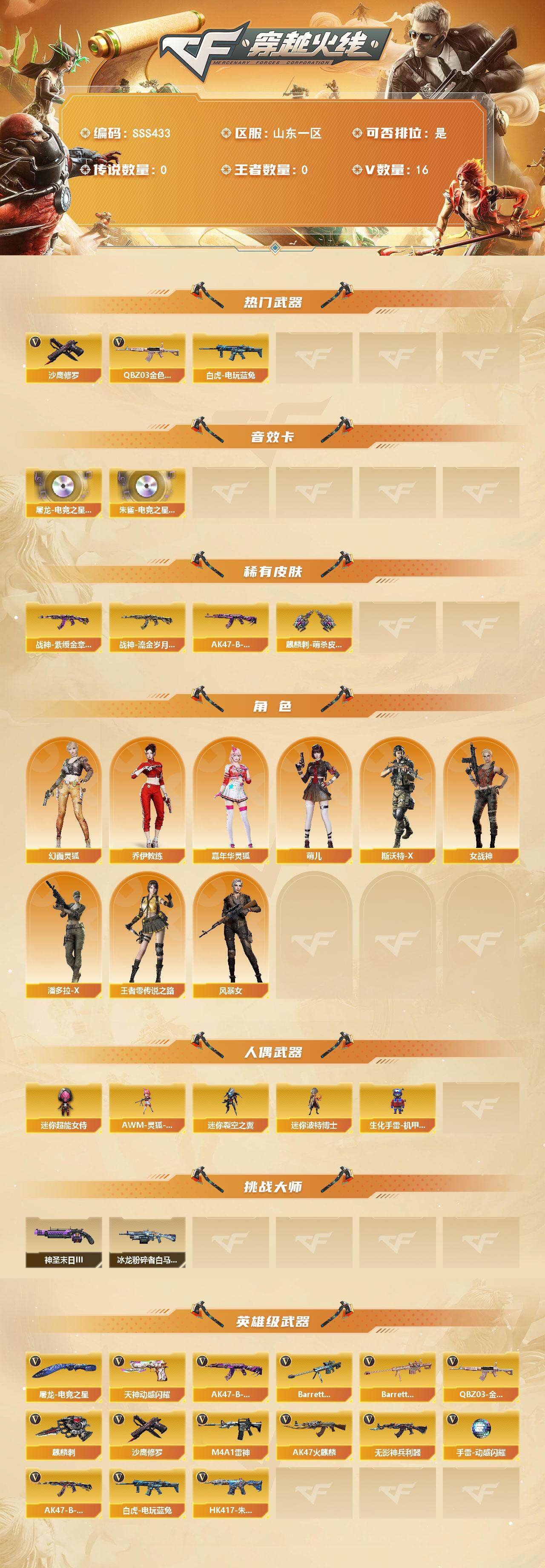 [18068861]山东一区-17V-0王者武器数-0炫金武器数 【热门武器】:QBZ03-金色蔷薇,白虎-电玩蓝兔,沙鹰-修罗 【音效卡】:屠龙-电竞之星-竞星跃动音效卡,HK417-朱雀-电竞之星-竞星跃动音效卡 【皮肤】:战神-紫绶金章皮肤*2,战神-流金岁月皮肤,AK47-B-常胜将军-曹操*2,麒麟刺-萌杀皮肤 【角色】:乔伊教练,幻面灵狐,风暴女,嘉年华灵狐,萌儿,女战神,潘多拉-X,斯沃特-X,王者-零-传说之路 【人偶武器】:AWM-灵狐-15周年嘉年华,迷你裂空之翼,迷你波特博士,生化手雷-机甲核心,迷你超能女侍 【挑战大师】:冰龙粉碎者-白马银枪*2,神圣爆裂者-末日III 【英雄级武器】:AK47-火麒麟,M4A1-雷神,无影-神兵利器,QBZ03-金色蔷薇,AK47-B-战神,AK47-B-常胜将军,白虎-电玩蓝兔,HK417-朱雀-电竞之星,Barrett-金色蔷薇,Barrett-暗月传说,沙鹰-修罗,天神-动感闪耀,麒麟刺,屠龙-电竞之星,手雷-动感闪耀 【其他武器】:源·火麒麟*2,源-黑龙,源·雷神*2,魂·雷神-维纳斯,魂-雷神-萌杀,魂·雷神-15周年嘉年华,御·雷神-烈虎*2,源·黑骑士,魂·黑骑士-现代金属*2,魂·黑骑士-幻能朋克,御·黑骑士-冰魄,源·AK47-黑武士,源·天启,源·武圣,源·机械迷城,源-龙血,魂·龙血-锋芒破茧*2,源-极光,源·天龙,AWM-裁决-百城联赛天津,魂·裁决-新人王绿豆,魂·裁决-羽掣,源·毁灭,魂·毁灭-青帝,魂·炼狱-玩具枪,魂·炼狱-月,加特林-炼狱-掌火,魂·修罗-15周年嘉年华,源·天神,魂·天神-宇航兔兔,灵·天神-炫光,魂·屠龙-都是Cfer,魂·擎天-破浪10年,源·龙啸,魂·龙啸-NICE,魂·龙啸-玩具枪 【道具】:夺命之镰,防化服,金色流光-枪王排位,电玩兔兔表情,防弹头盔*5,防弹衣*5,C4工具钳*5,手雷包*5 【特殊枪械】: