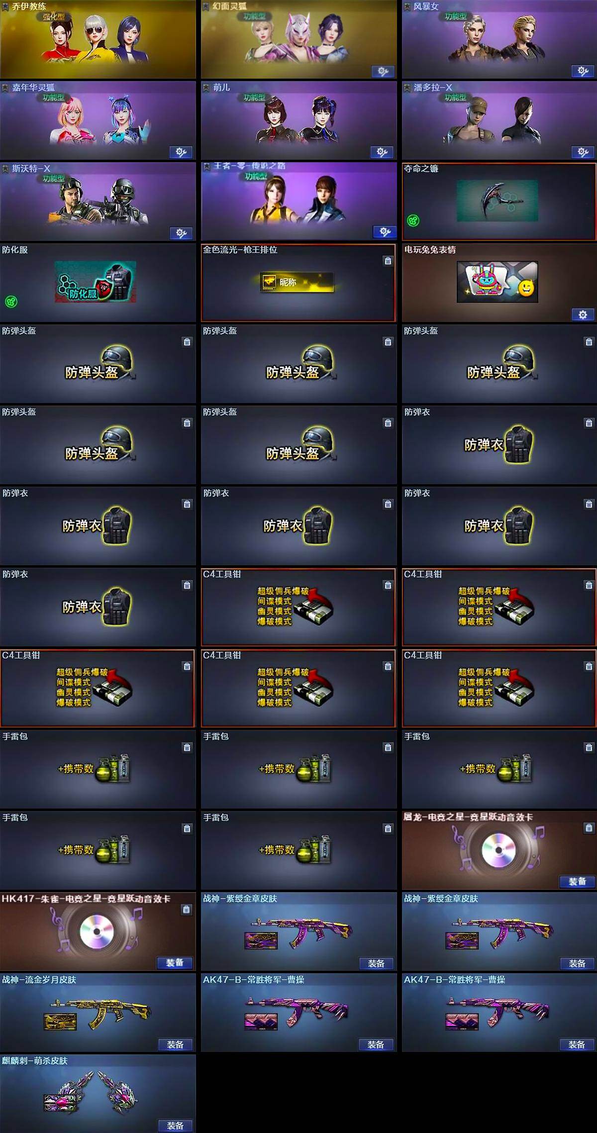 【道具】:夺命之镰,防化服,金色流光-枪王排位,电玩兔兔表情,防弹头盔*5,防弹衣*5,C4工具钳*5,手雷包*5